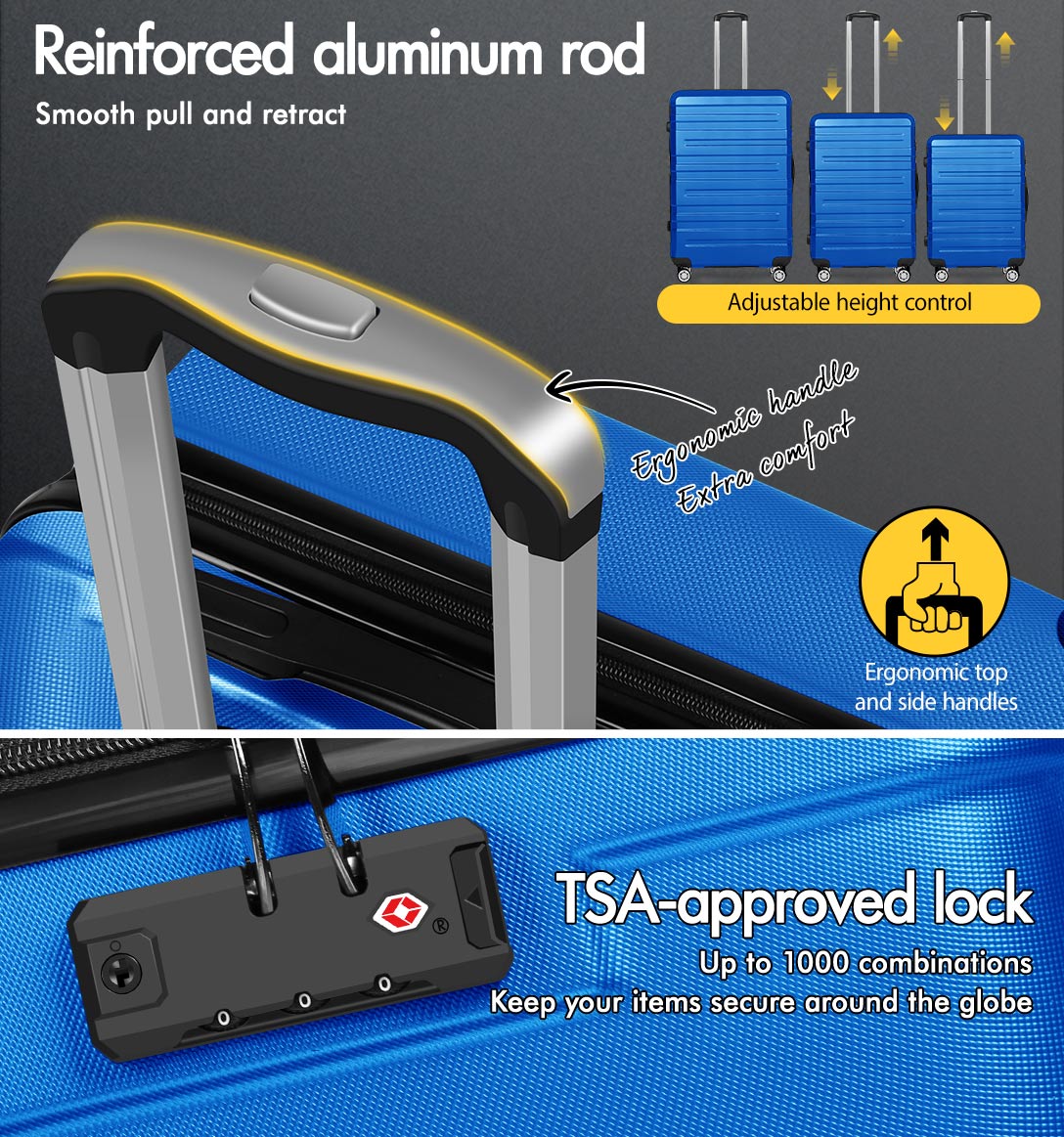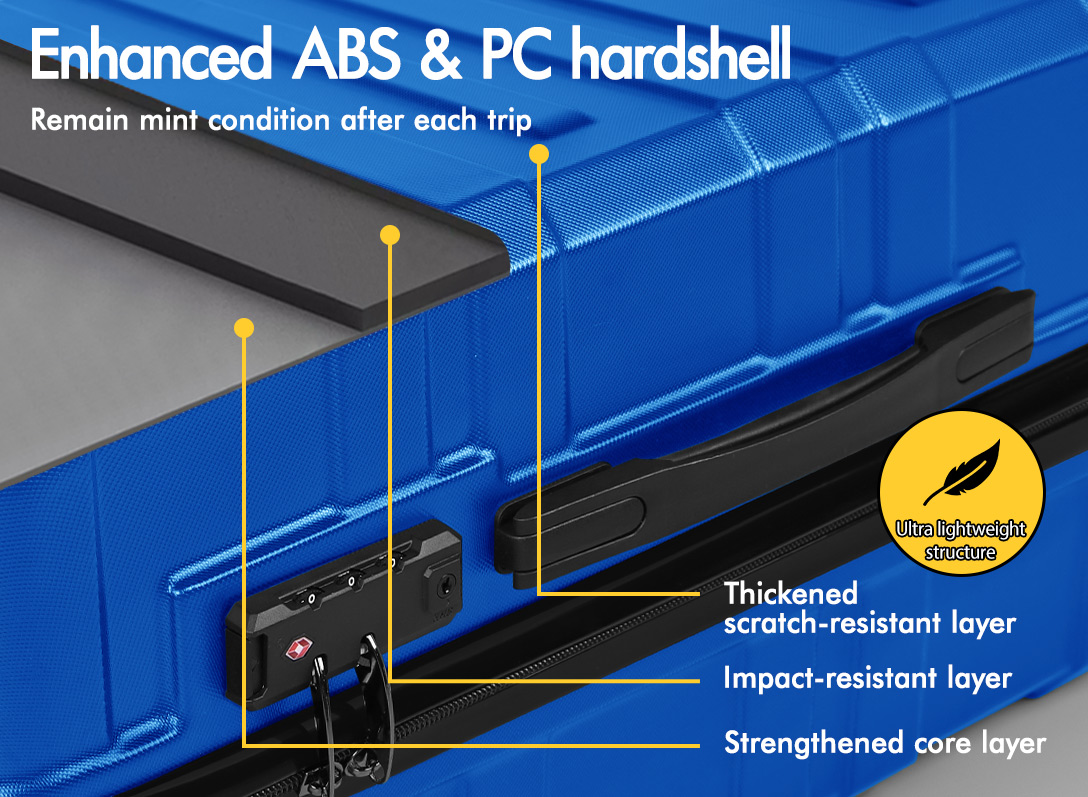 Crafted from robust ABS and PC materials, the suitcases strike the perfect balance between durability and lightweight design. It not only strengthens the suitcase shell’s resilience against breaks and color fading but also ensures that your luggage stays looking vibrant trip after trip.