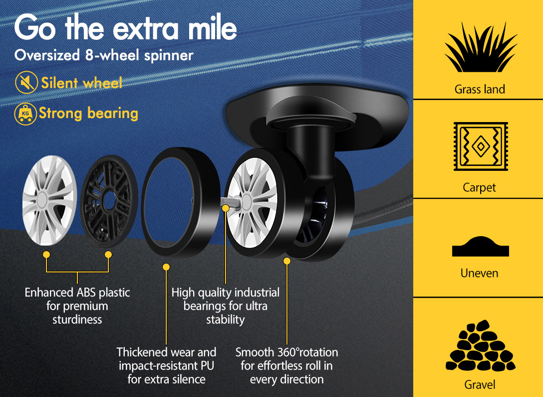 Navigating through crowded airports and bustling streets are a breeze, thanks to the oversized 360° 8-wheel spinner that ensure smooth mobility in any direction. The adjustable retractable pull rod offers height flexibility, making it comfortable for all travelers.