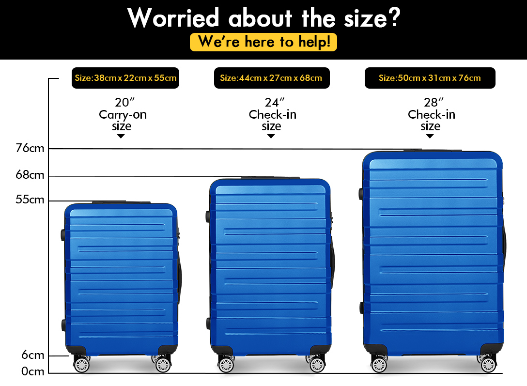Specifications* Model: Hero * Material: ABS + PC* Interior: Eco-friendly polyester lining * Handle: Premium aluminum, PP* 20" weight and dimension: 3kg, 38 x 22 x 55cm* 24" weight and dimension: 4kg, 44 x 27 x 68cm * 28" weight and dimension: 5kg, 50 x 31 x 76cm * 20" loading capacity: 40L * 24" loading capacity: 65L * 28" loading capacity: 100L* Height with handle pull out: 107cm* Colour: Blue
