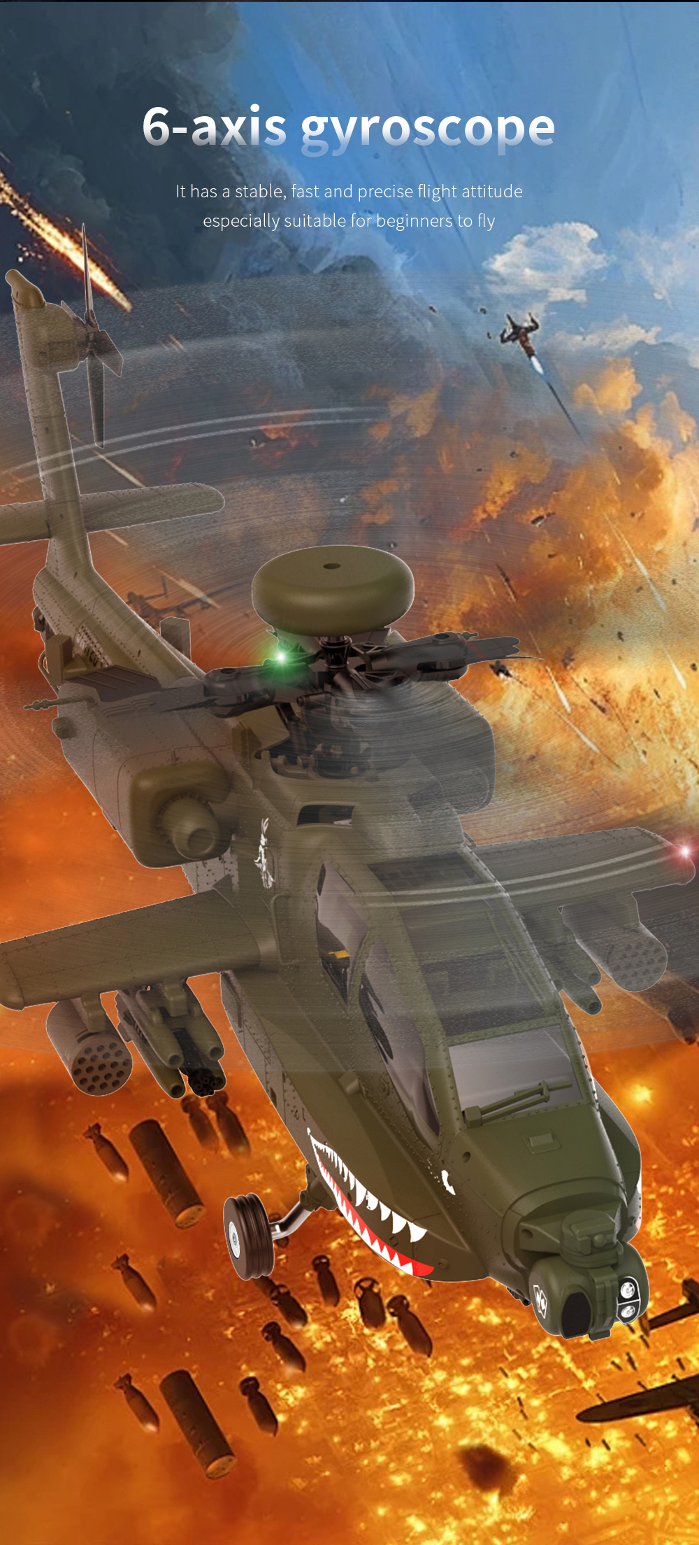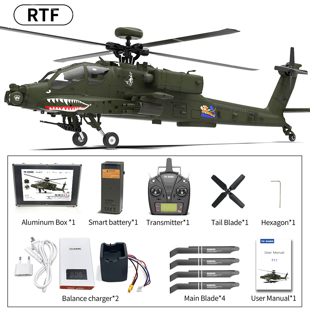 F11 Apache RC Helicopter,Utilizes a no-aileron design with dual-axis coaxial drive motors and electronic stabilization system,equipped with a 6-axis gyroscope,uses 2.4GHz communication protoco,standard six-channel remote controller.