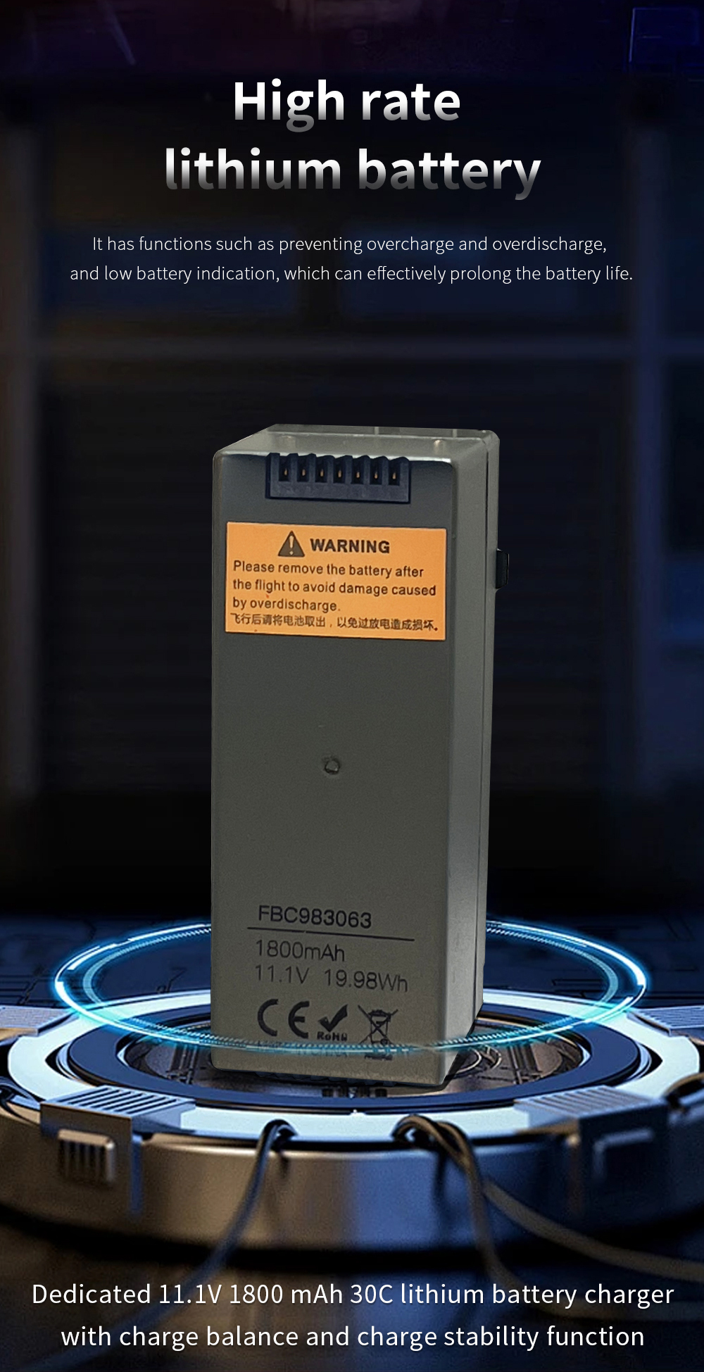 12. Professionally customized high-rate Lithium-Polymer 11.1V 1800mAh 30C battery for high discharge rate, long lifespan, and 10-12 minutes of flight time. Can withstand 500+ cycles with features like overcharge, over-discharge protection, and low battery indication, effectively extending battery life.