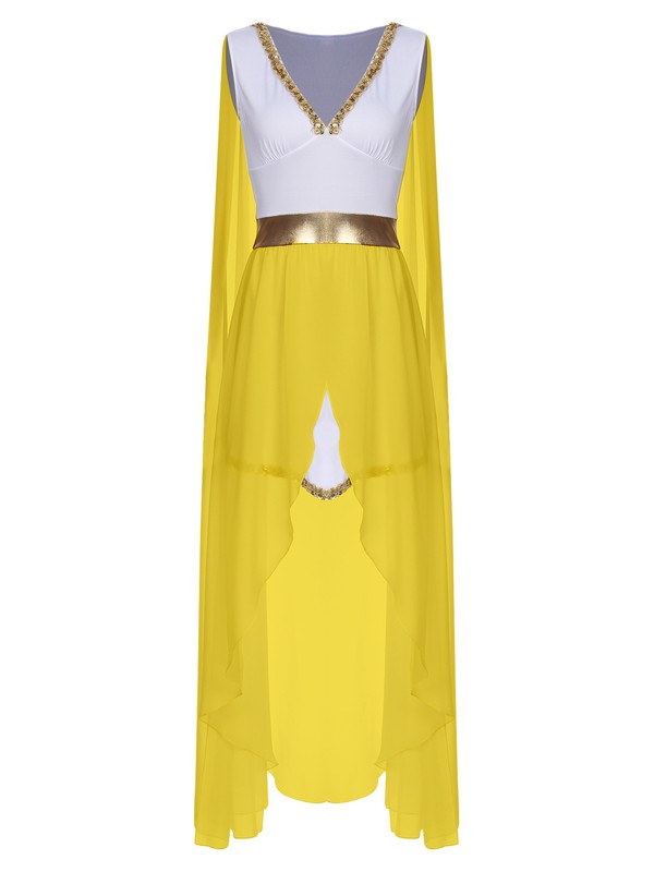 Styled with ancient Greek costume, dress designs with v neck, cape sleeve, high waistline, sequins trim and chiffon cover-up on the skirt.