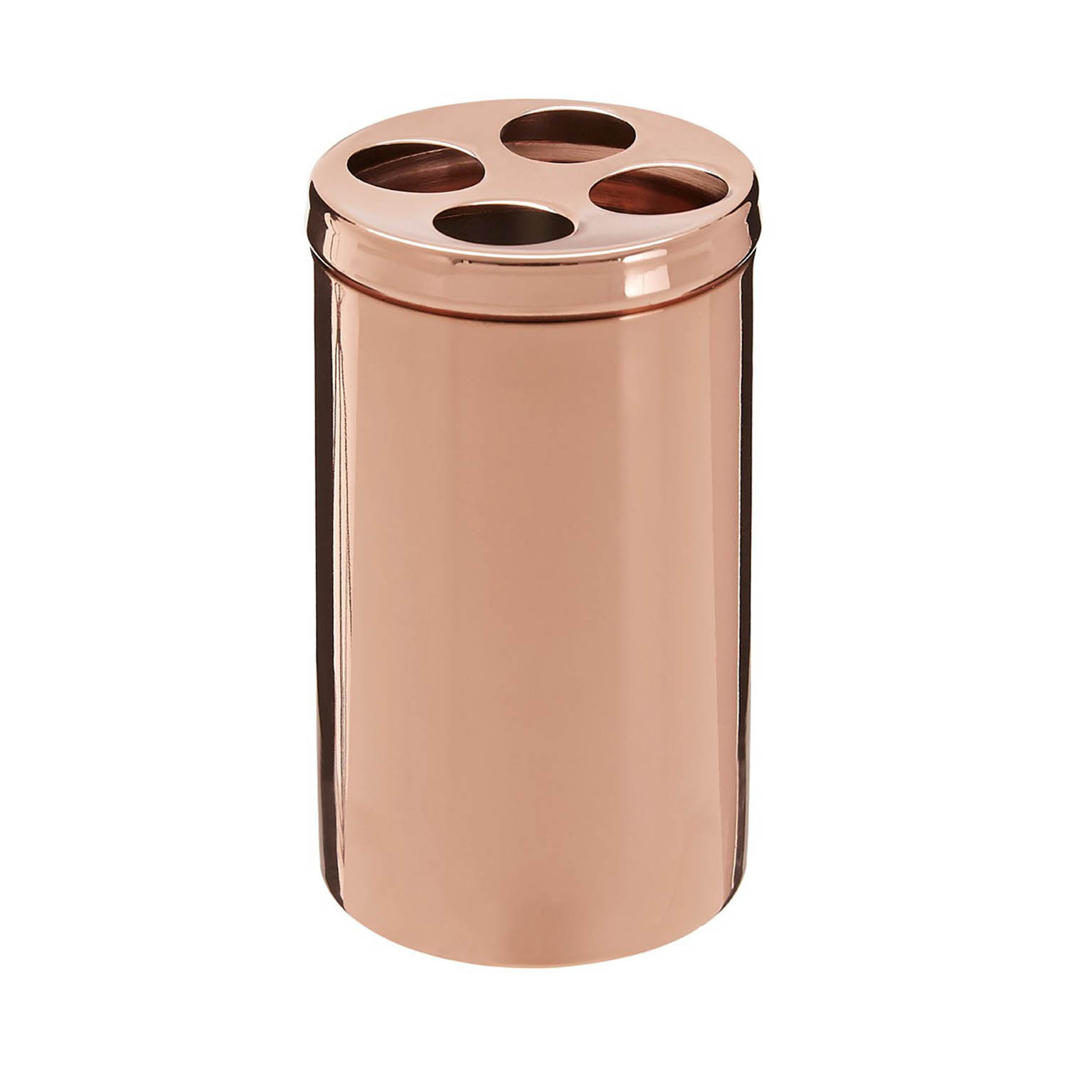 Its lid has four round holes that hold toothbrushes securely, also ensuring that the brush heads remain separated for better hygiene. Comes with a soap dish. The smooth and strong stainless steel has a luxurious rose gold finish that adds a warm metallic accent to the bathroom.