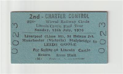 I offer an Edmondson ticket : BR : Wirral Railway Circle "Lincoln Castle" Rail Tour Liverpool Lime Street to Goole for a trip on the Humber Ferry "Lincoln Castle". I have a second ticket available, No.0024. First to purchase has the choice of number.