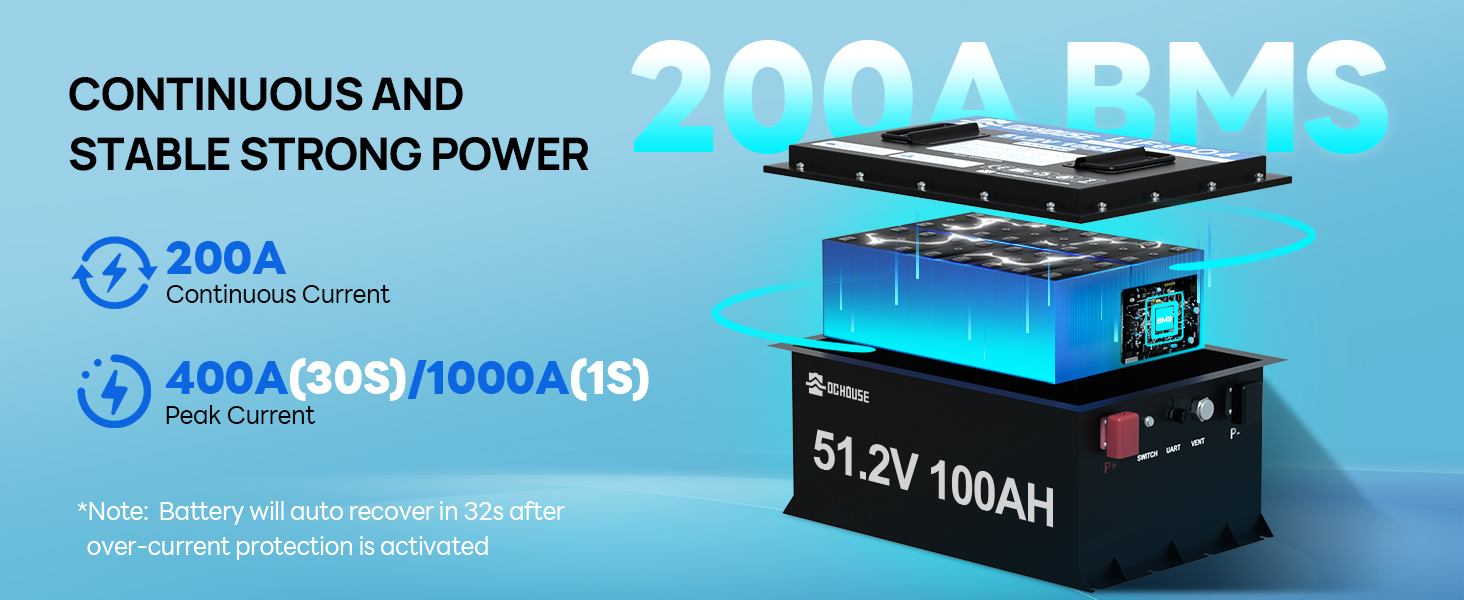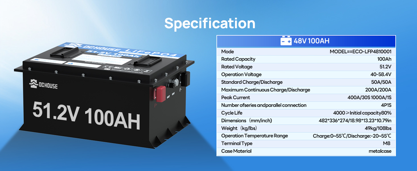 48V 100AH Lithium Battery powered by A-grade cells, providing superior energy density and stable performance. It can be used for more than 4000 cycles. Operating temperature range: charging 0~55℃, discharging: -20~55℃; temperature protection. Compared with lead-acid batteries, the life span is more than eight times longer.