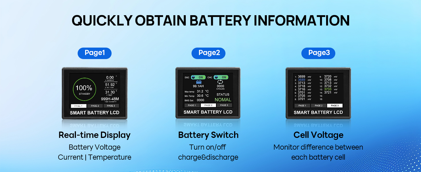 Supports Bluetooth & Touch Screen for seamless battery info monitoring. Wirelessly check capacity & monitor power levels for smarter, easier battery management. An intelligent touch display specifically designed for battery monitoring, it can more accurately monitor battery percentage, voltage, current, capacity, and more in real-time.