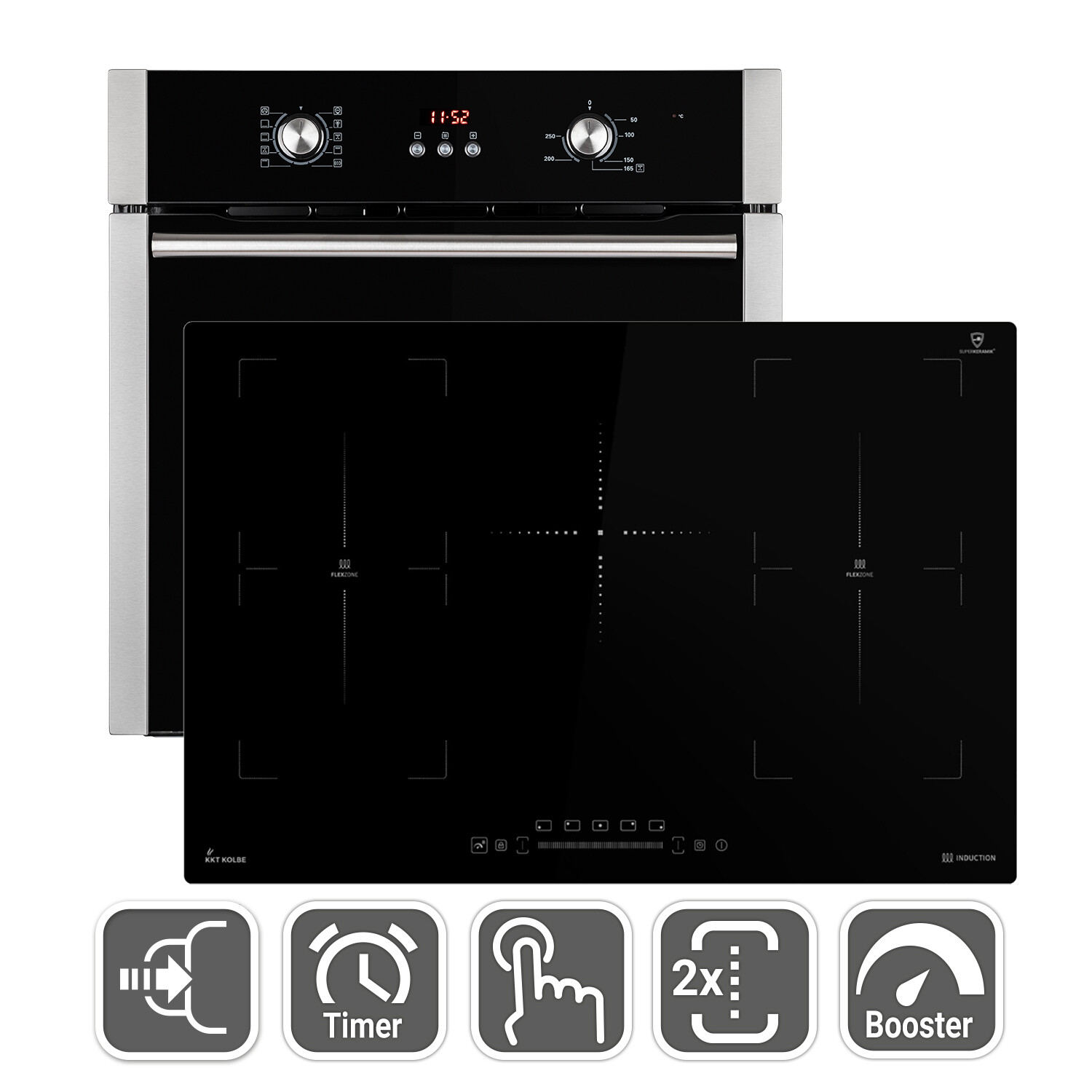 - Kochfelder Details: 2x 1200W 165mm, 1x 2000W 230mm, 1x 1100/2000W 165/270mm