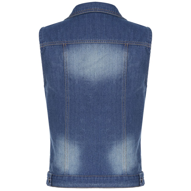 Turn-down collar sleeveless denim jacket with two flap pockets on the chest and button closure for easy wearing.