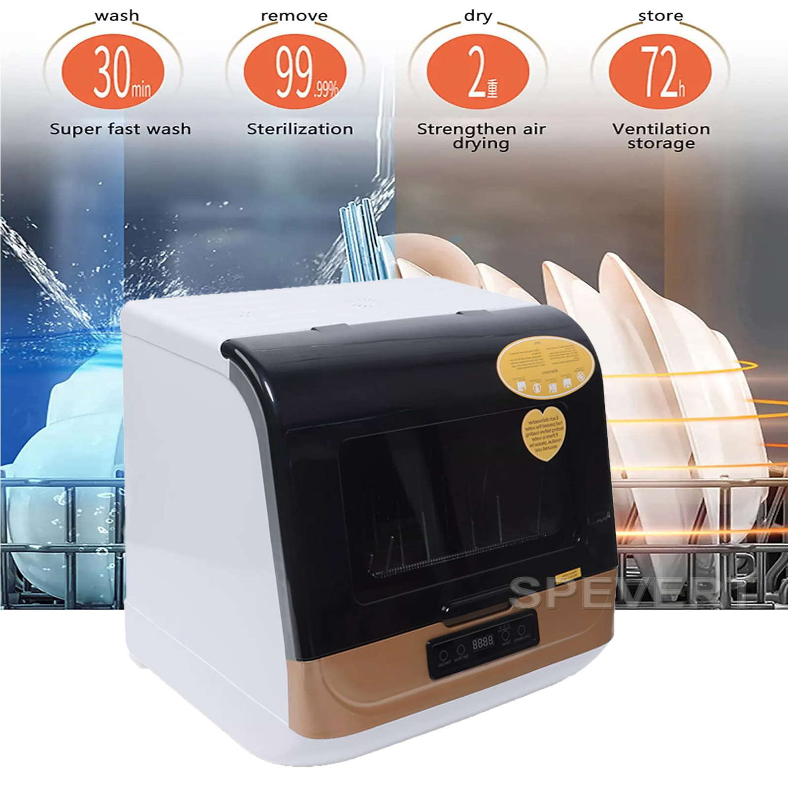 This dishwasher consumes 2 gal water to wash the dishes, which saves much more water than traditional hand washing.