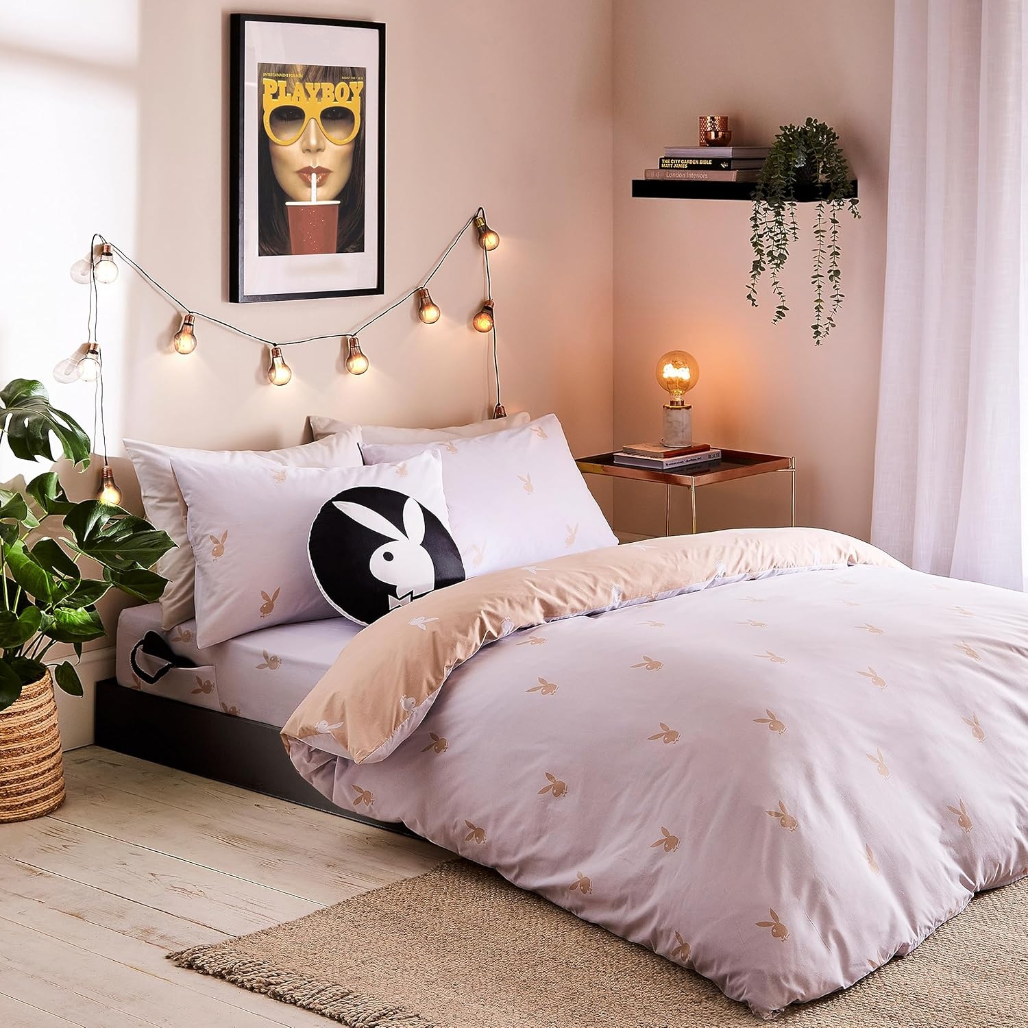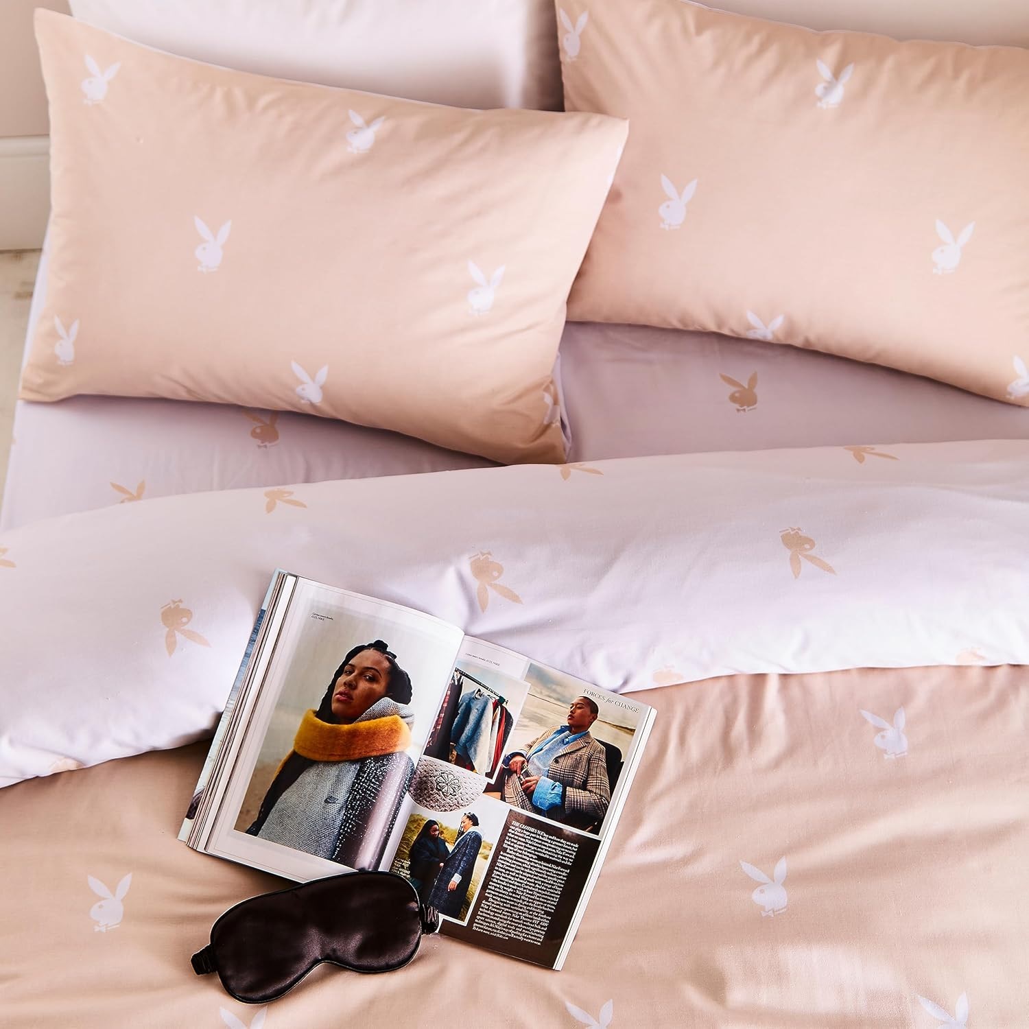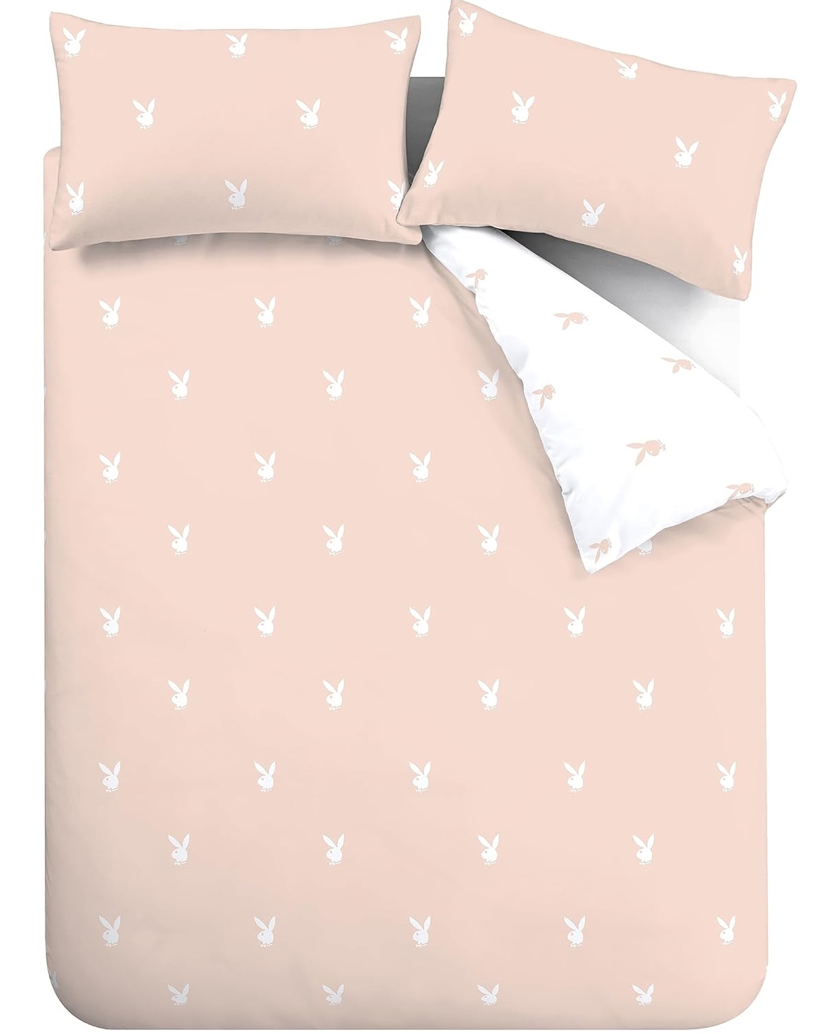 This luxury and fully reversible duvet cover set has playboy and the rabbit head design on it. Material: 52% Polyester and 48% Cotton, it is machine washable. This set includes 1 x king duvet cover and 2 x pillowcases, duvet cover size is 230cm x 220cm (91" x 87") (Approx) and pillowcase size is 48cm x 74cm (19" x 29")(Approx).