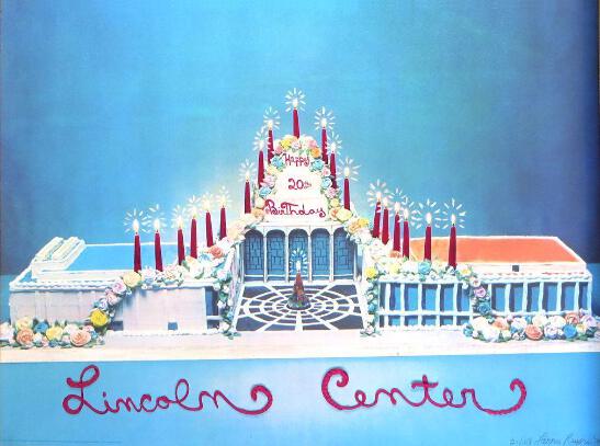 A birthday cake offset lithograph by Larry Rivers made in the shape of the famous performance art spot in New York City, Lincoln Center. A fun work set on waves of dark and bright blue. Signed and numbered by the artist, unframed.