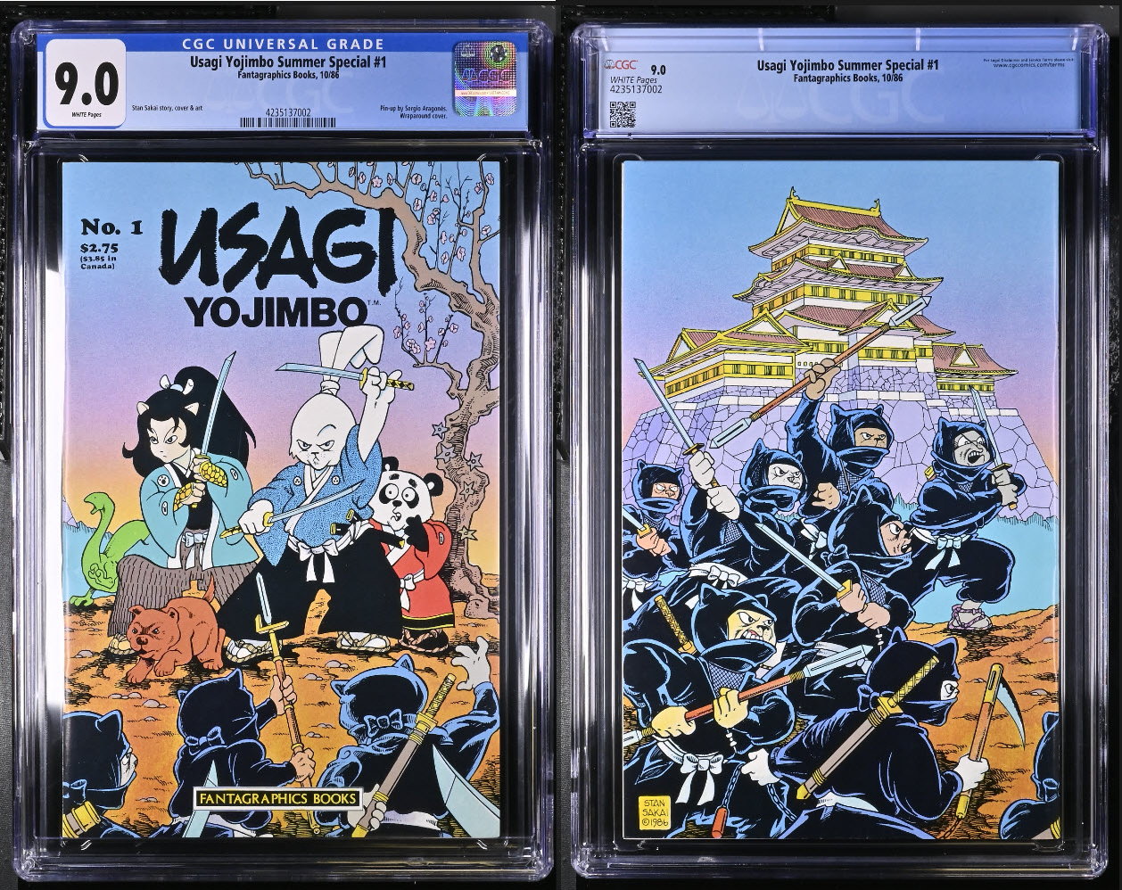 Usagi Yojimbo #1 Summer Special (Fantagraphics Books 1986) CGC 9.0 White Pages! Usagi Yojimbo #1 (Fantagraphics Books 1987 First Series) CGC 9.2 First Printing. All comics will be shipped to U.S. and foreign addresses with all books bagged and boarded after payment is received. One regular sized book with cardboard stiffener weighs about 7-8 ounces. Large trade paperbacks are more like 26-30 ounces. Each additional regular sized book adds about 3 ounces but the eBay calculator will count each of them at 7-8 ounces so wait for an invoice if you have multiple wins. I do combine shipping. Orders in the United States or international will be sent through first class or priority mail with calculated postage depending on type of service selected. I have thousands of other comics mostly from the late 70's to late 80's. Let me know if there is anything else you need and we can combine on the shipping. |