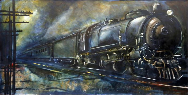 Michael Paraskevas's expressive depiction of a train traveling through the night is rendered realistically with intense color.