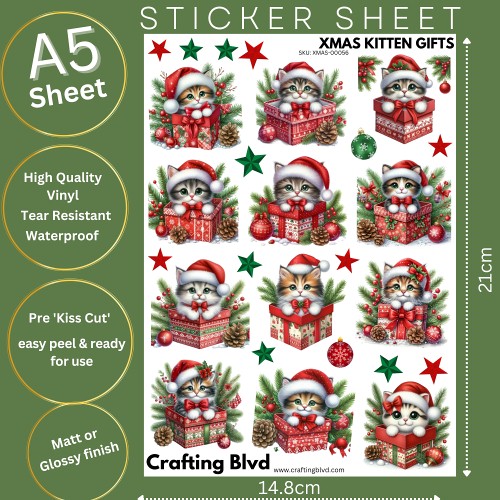 - 1 x A5 Sheet of Vinyl Stickers as per pictures. The sheet measures 148mm (w) x 210mm (w) - (14.8cm x 21)cm. Each sticker on the sheet is individually 'Kiss Cut' - Easy to peel & ready to use. Custom made from Quality premium Vinyl; Waterproof & Tear Resistant & are available in either a Glossy or Matt finish or