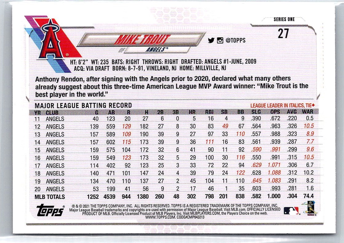 | Description: | Mike Trout | | Category: | Baseball | | Year: | 2021 | | Product: | Topps | | Team: | Los Angeles Angels | | Card Number: | 27 | | Dimensions: | 3¼" x 2¼" | | SKU: | BL B0002 R05 T (66) |