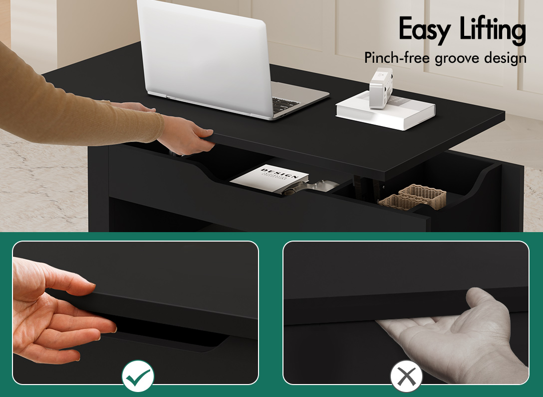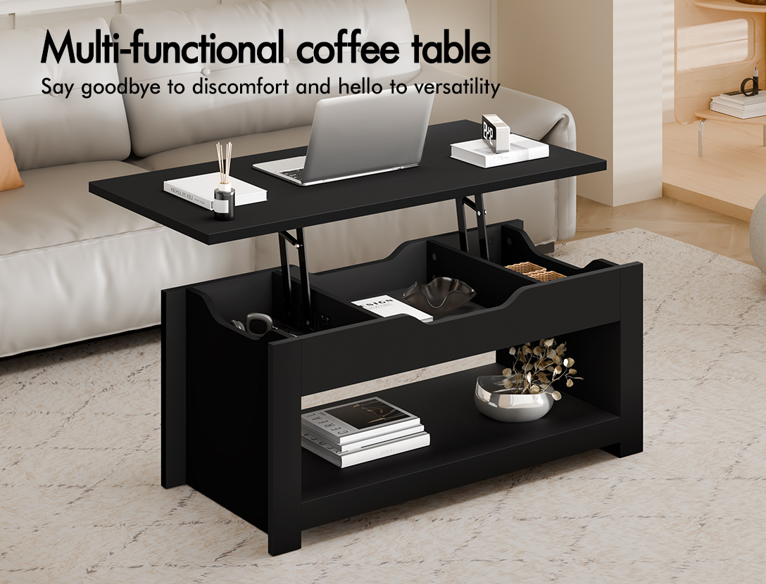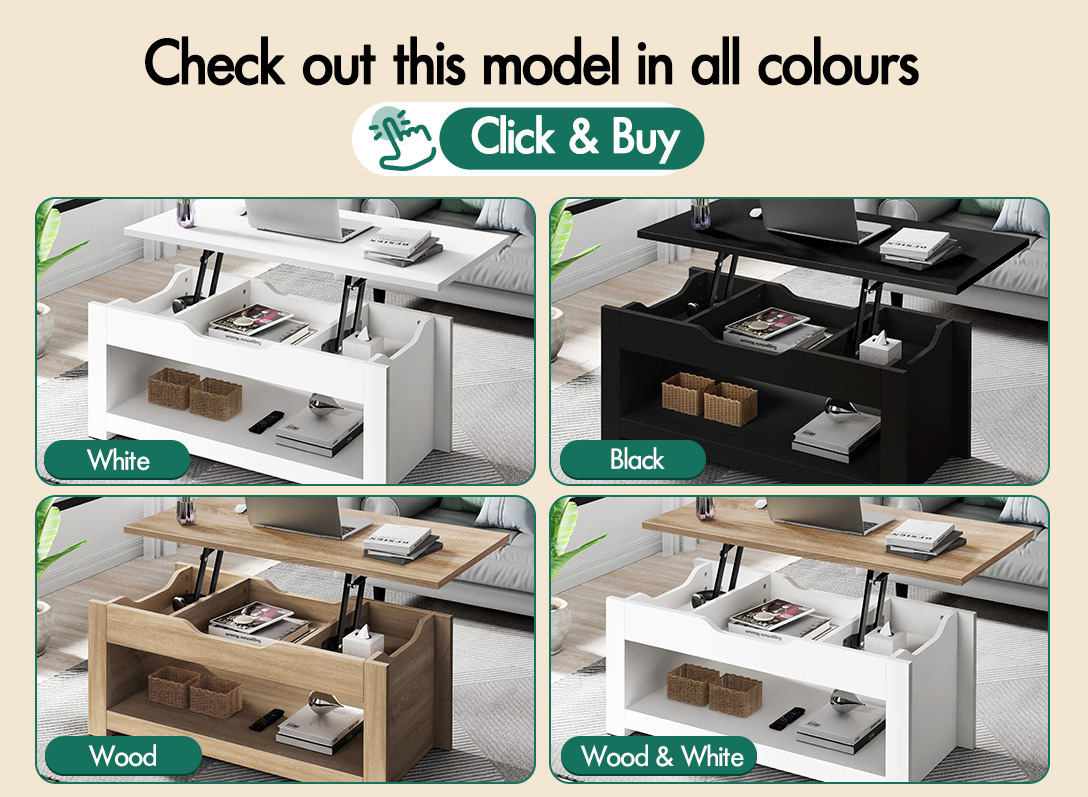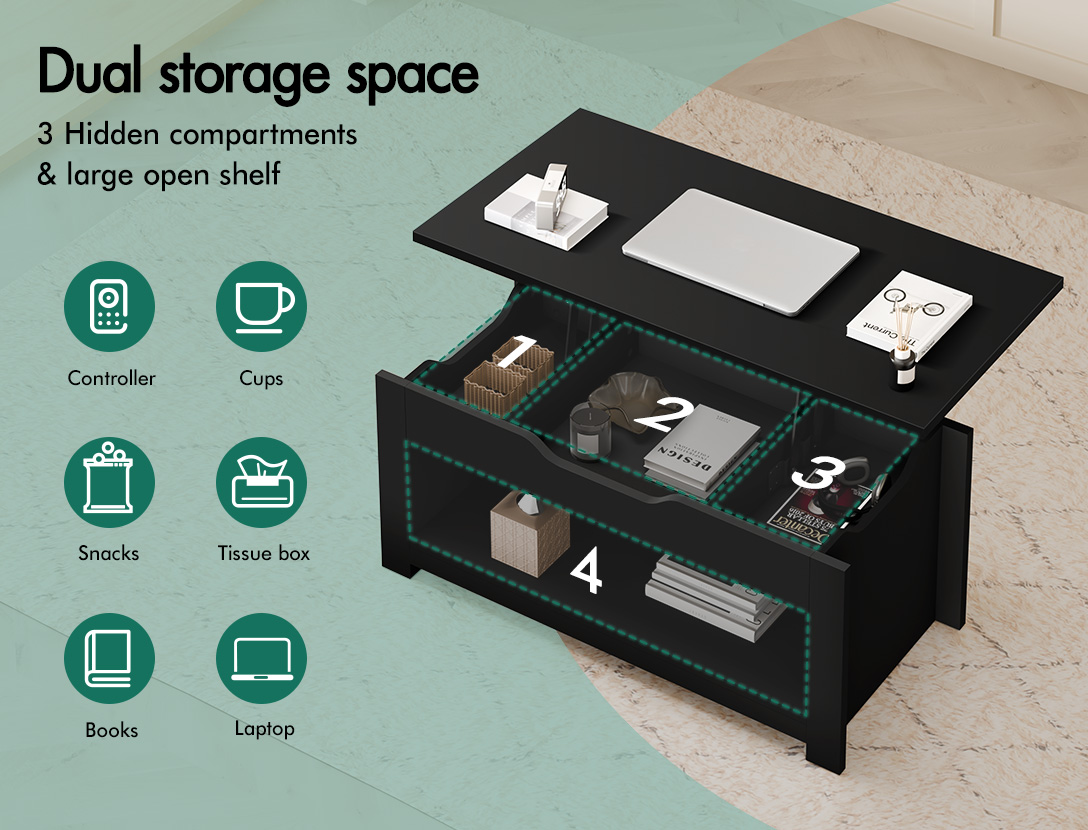 * Innovative lift-top design* 3 hidden storage components* Spacious bottom open shelf* Heavy-duty gas lift mechanism for smooth operation* E1 grade thick particle board* Improved scratch-resistant melamine finish* Longer life span than paper finish* Handle-free design* Smooth edges* Compact & space-saving* Solid construction* Easy assembly* Easy to clean