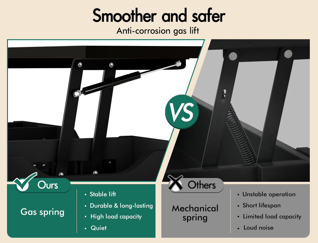 Crafted from superior E1 grade and 15mm thick particle board, our coffee table is designed to be highly durable. Unlike some other sellers, we have no compromise on materials used. Well made with melamine finish, it is waterproof, anti-scratched and easy to maintain and clean. Eqquiped with metal gas lift instead of spring lifting mechanism, our hardware ensures strong durability and for long lasting use.