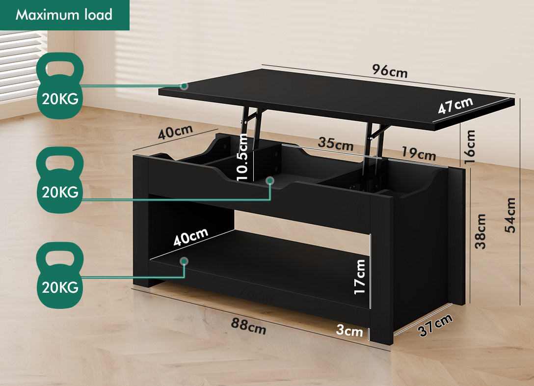 Specifications* Colour: Black* Number of shelves: 4* Material: 15mm thick and particle board* Wood finish: Melamine* Gas lift material: Power-coated steel* Weight capacity: up to 60kg* Overall dimensions: 96 cm x 54 cm x 47 cm (refer to dimension photo for detailed sizes)* Number of packages: 1