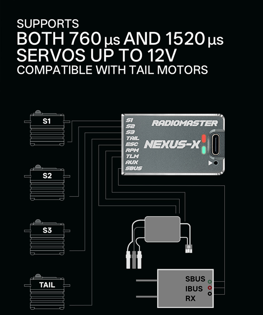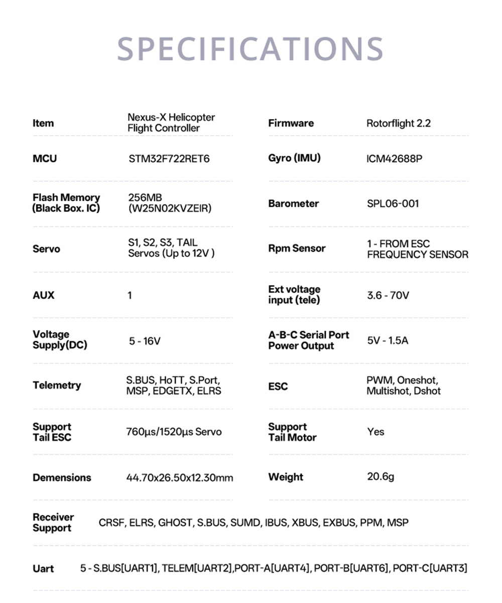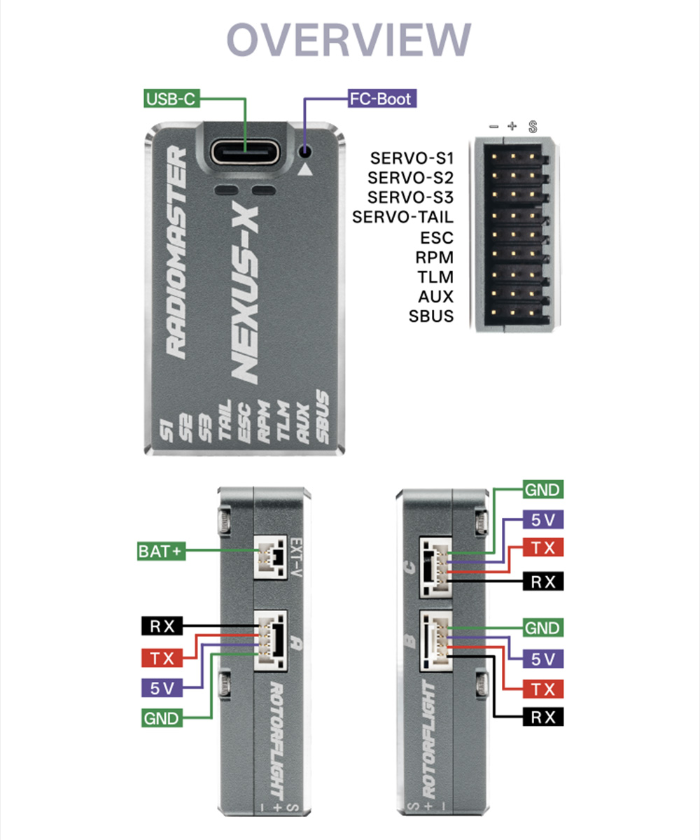 6. The Nexus measures just 41mm x 25mm and is only 13mm high, making it a perfect fit for any size heli build, including 250/450/500/550/600/700 helicopters.
