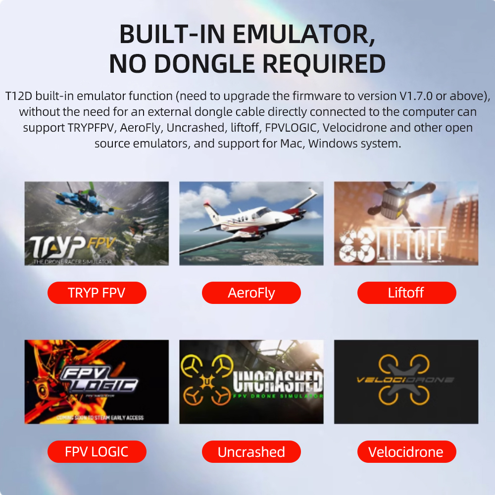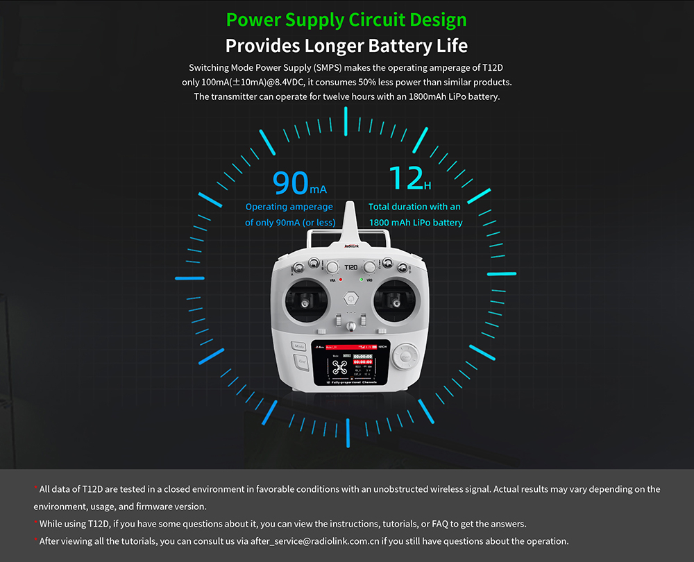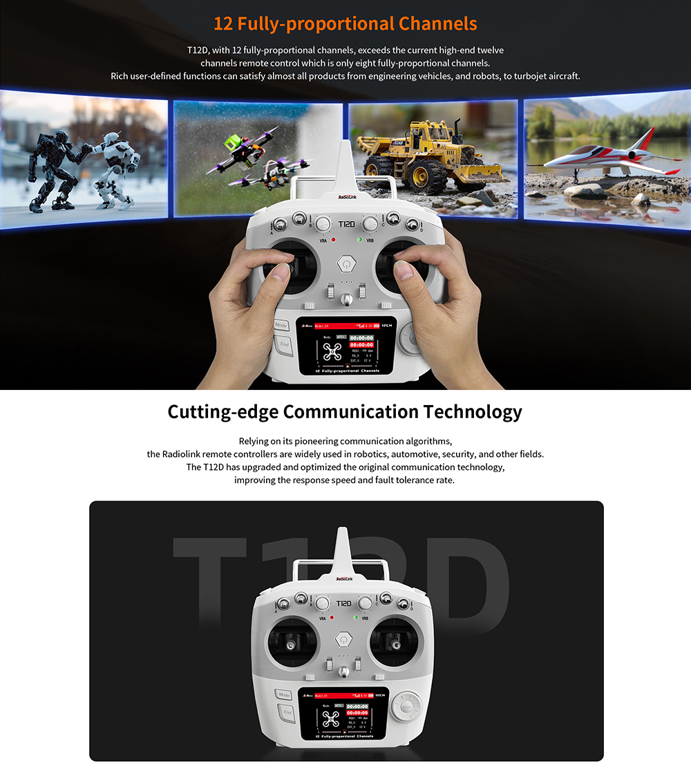 1. T12D, with 12 fully-proportional channels, Excellent Anti-interference Capability,SupportsELRS, TBS Crossfire, and other mainstream long-range modules to realize most of the aircraft parameters such as protocol, baud rate, WIFI mode, etc. can be adjusted by the T12D.