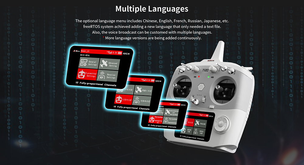 T12D, the 12 fully proportional channels with full models and full functions transmitters,1M bytes RAM Memory,208MHz Basic Frequency Memory, 2.8 inches, 320*240 pixels 16 colorful screens. three 3-position switches, one 2-position switch, 2 pieces of dials, 2 pieces of sliders,and ergonomically designed making the T12D fit a wide range of pilot needs.