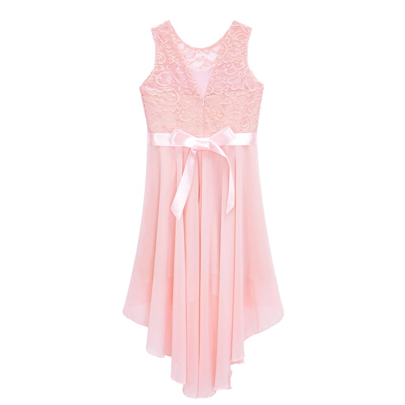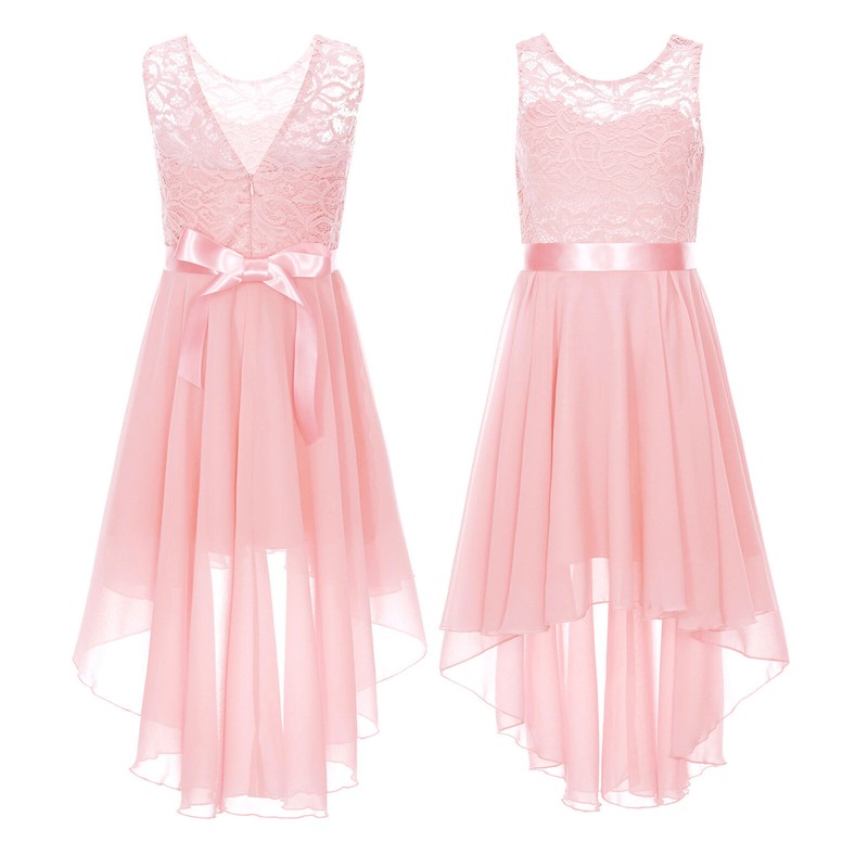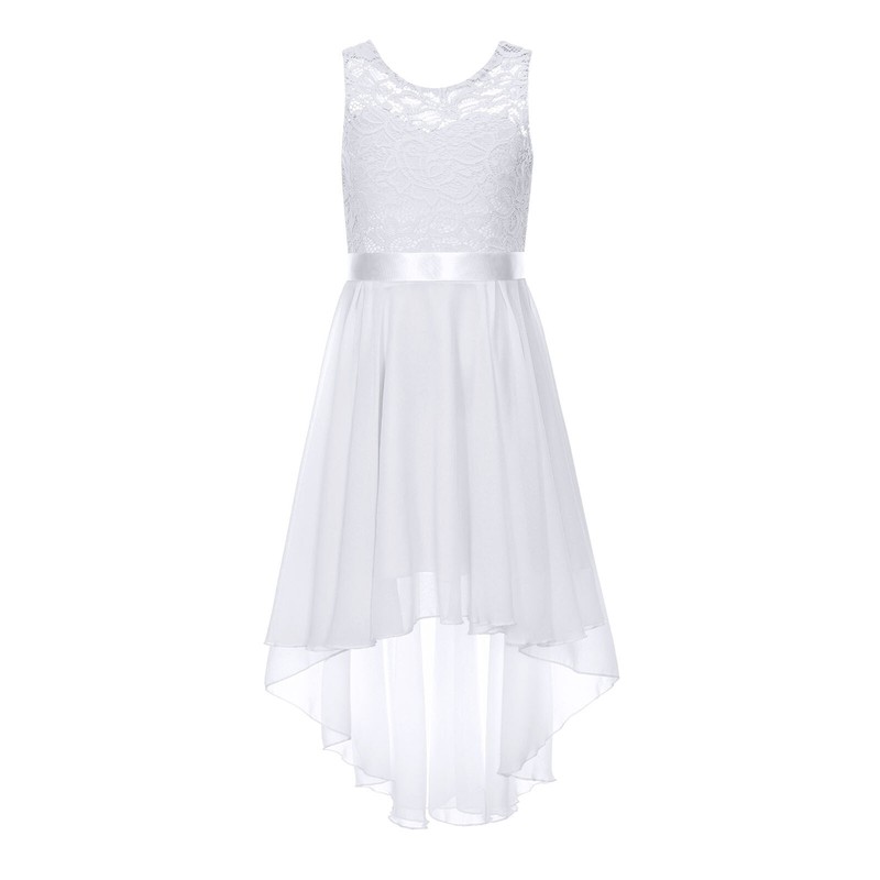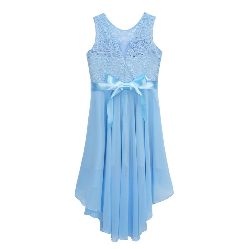 Sleeveless, embroidered floral lace top bodice, high-low hem design, graceful and elegant style.
