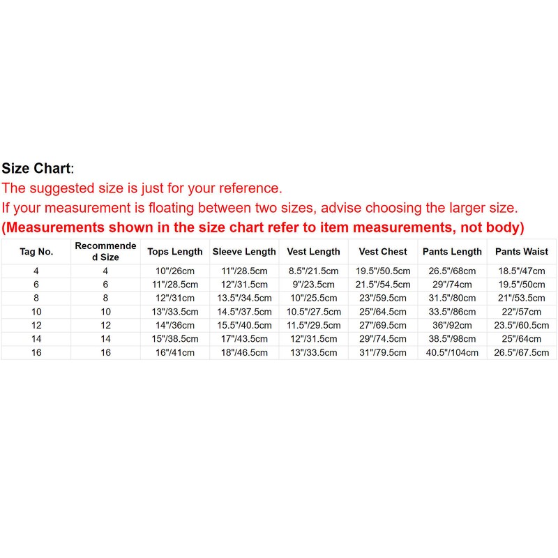 | Tag No. | Recommended Size | Tops Length | Sleeve Length | Vest Length | Vest Chest | Pants Length | Pants Waist |
