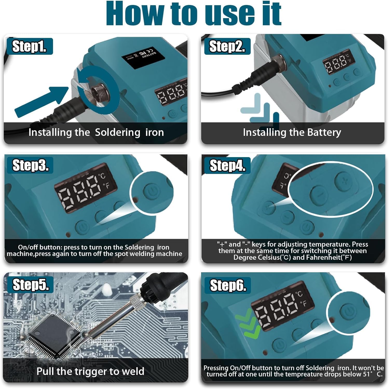 【LCD display and adjustable temperature】 The Cordless Soldering Iron Set can quickly heat up to 480°C /896 within 15 seconds, saving your waiting time and completing welding work more efficiently and faster. You can set the temperature of 124℃-896℃(51℃-480℃). ℃ or ℃ can be displayed. and adjust the temperature unit according to your needs by pressing the "+" "-buttons, and the temperature display is displayed on the LCD digital display to facilitate your welding work.