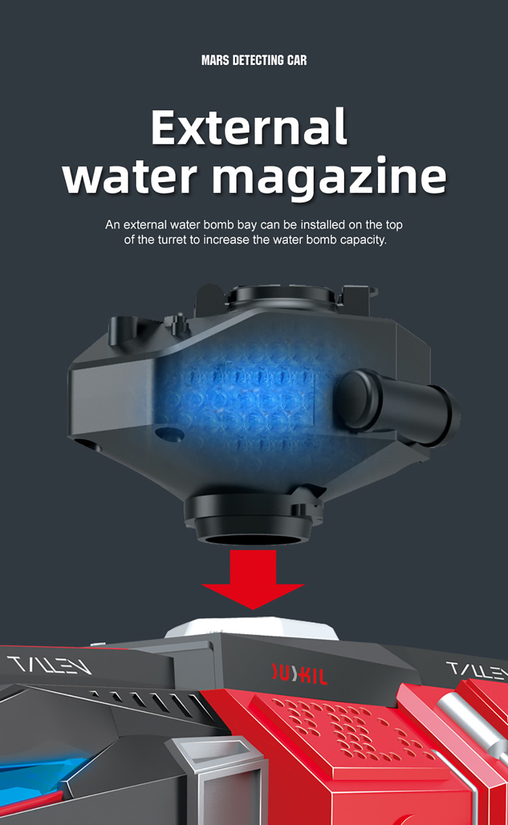 7. External water magazine: An external water bomb bay can be installed on the topof the turret to increase the water bomb capacity