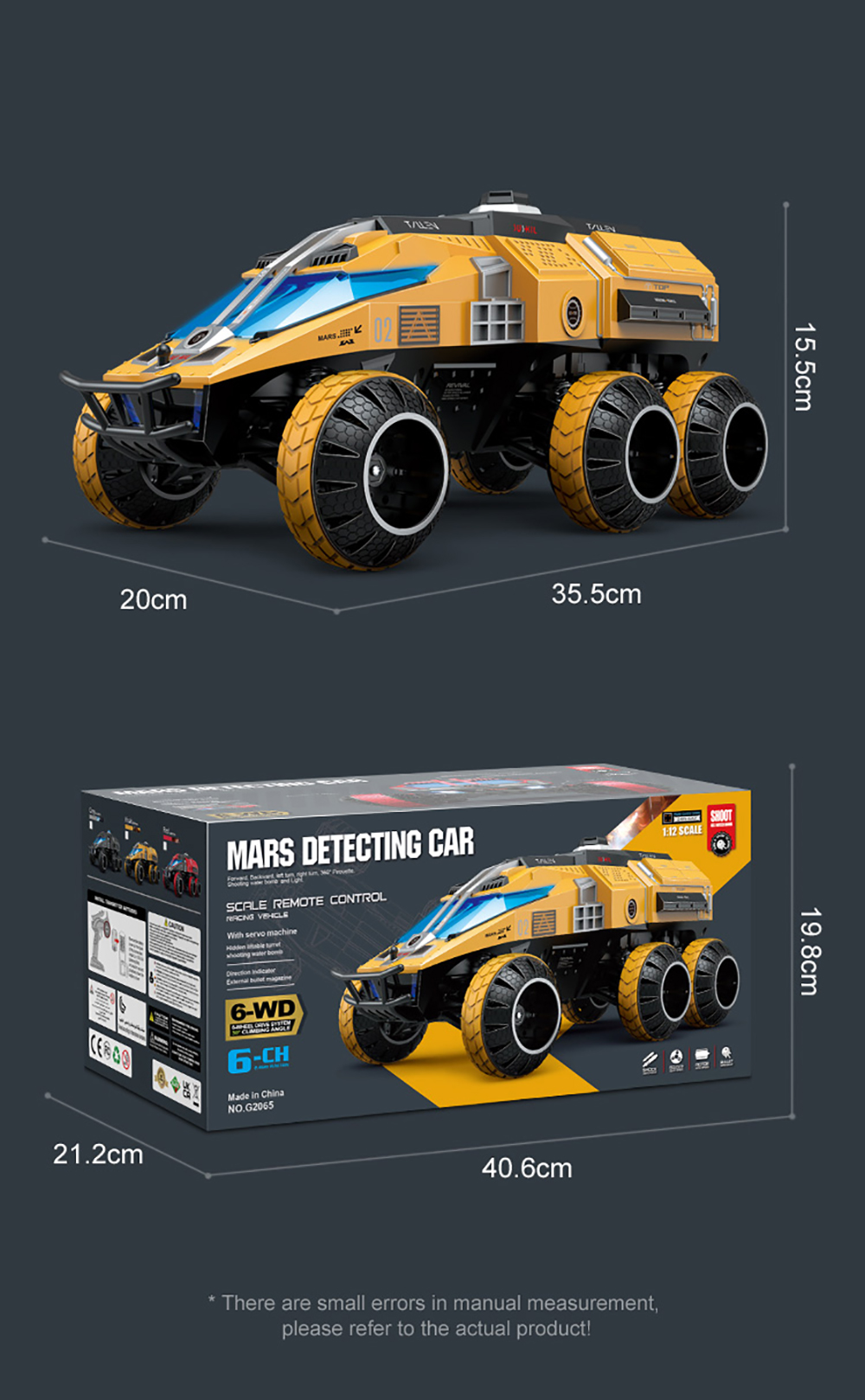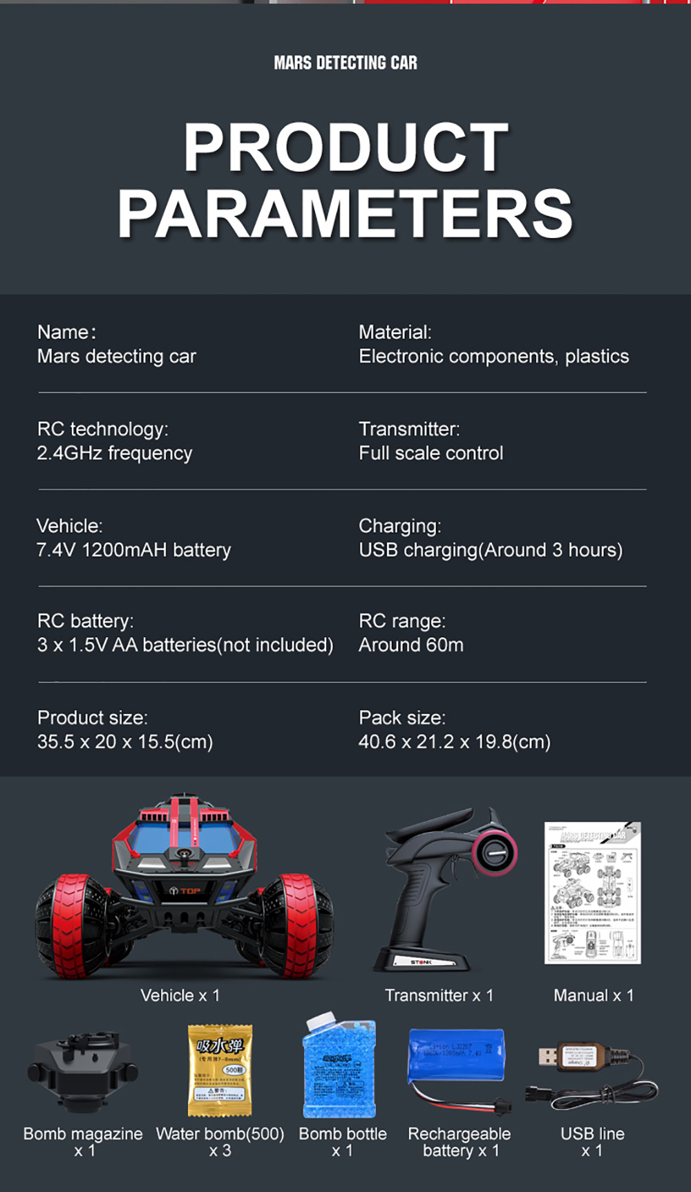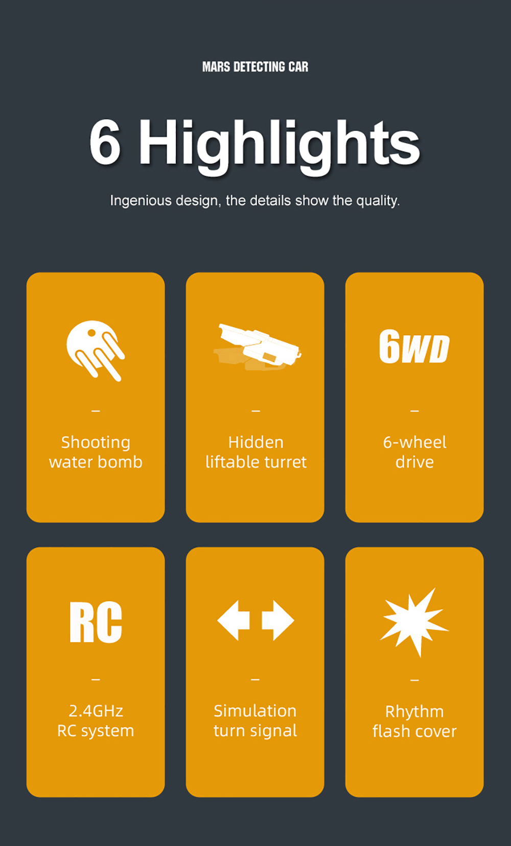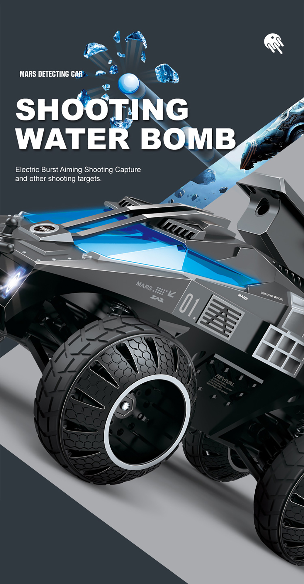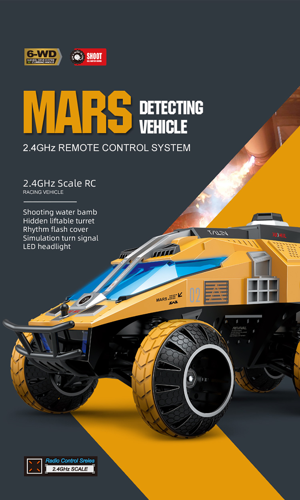 Q118 6WD Mars Detecting Car,With 2.4GHZ RC System,Hidden Liftable Turret Design,Can Fire Water Bombs Continuously,Rhythm Flash Cover Always On Staticallyand Flashing With The Rhythm When Shooting Bring You Full Game Experience!