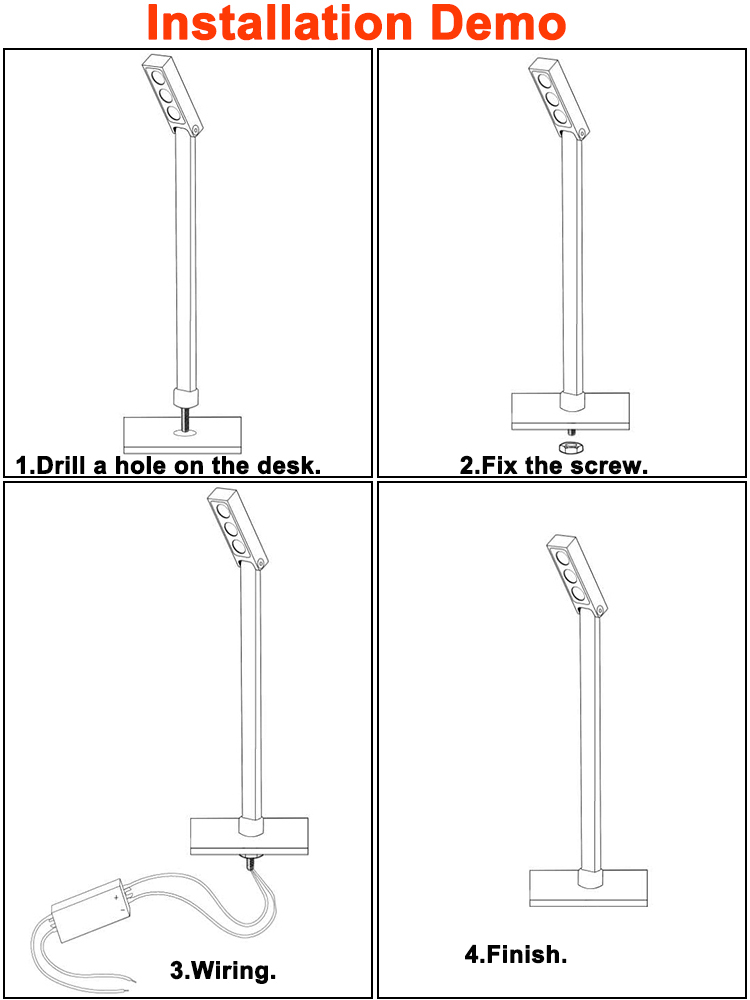Steps to install: 1.Drill a hole on the desk . 2.Fix the screw. 3.Connect the lamp to the LED driver.Then Connected the power cord. 4.Finish.