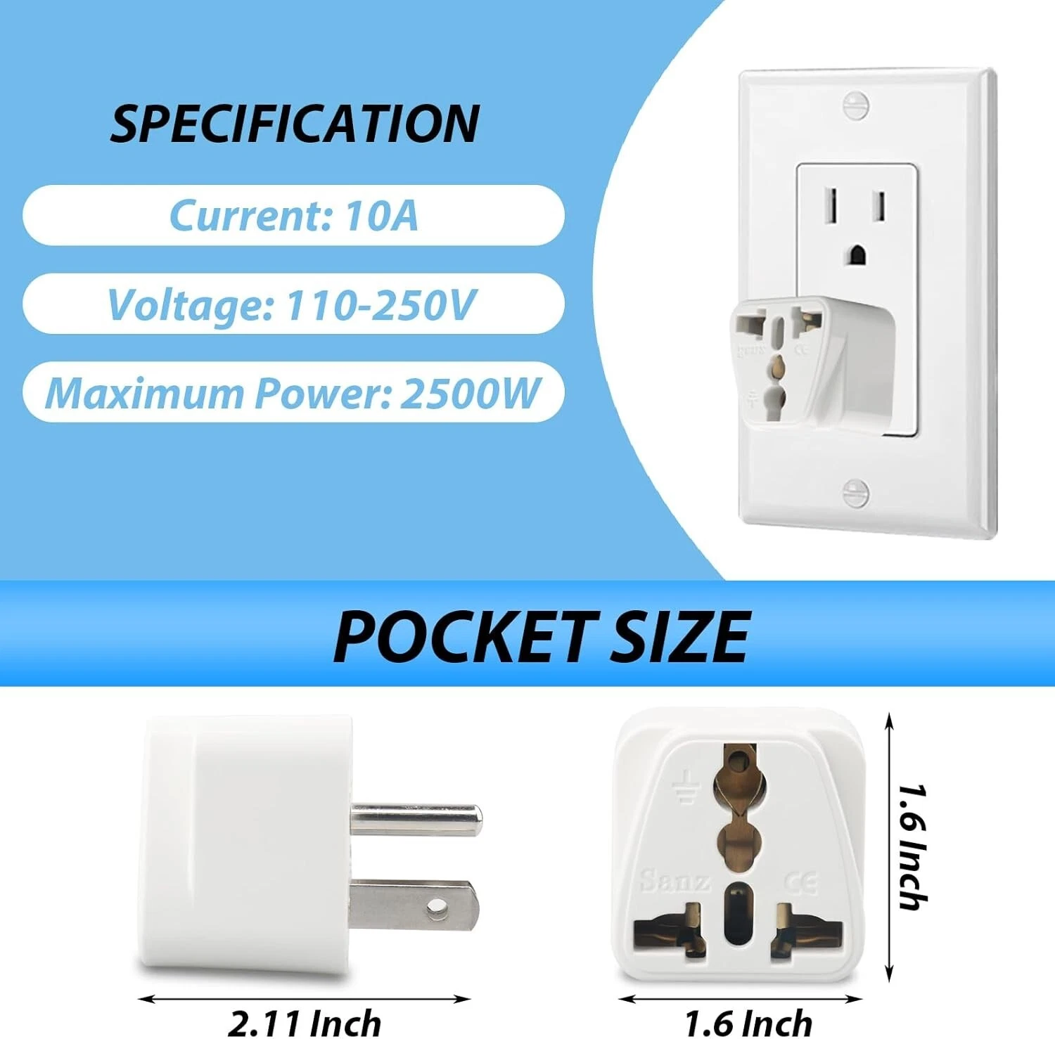- Safety: The universal plug adapter is made of safe pure copper conductor and ABS flame retardant material, with high strength, good toughness, no deformation, high-temperature resistance, and no safety risks. Voltage current: 10A / 125 ~ 250 V. Maximum power: 600W