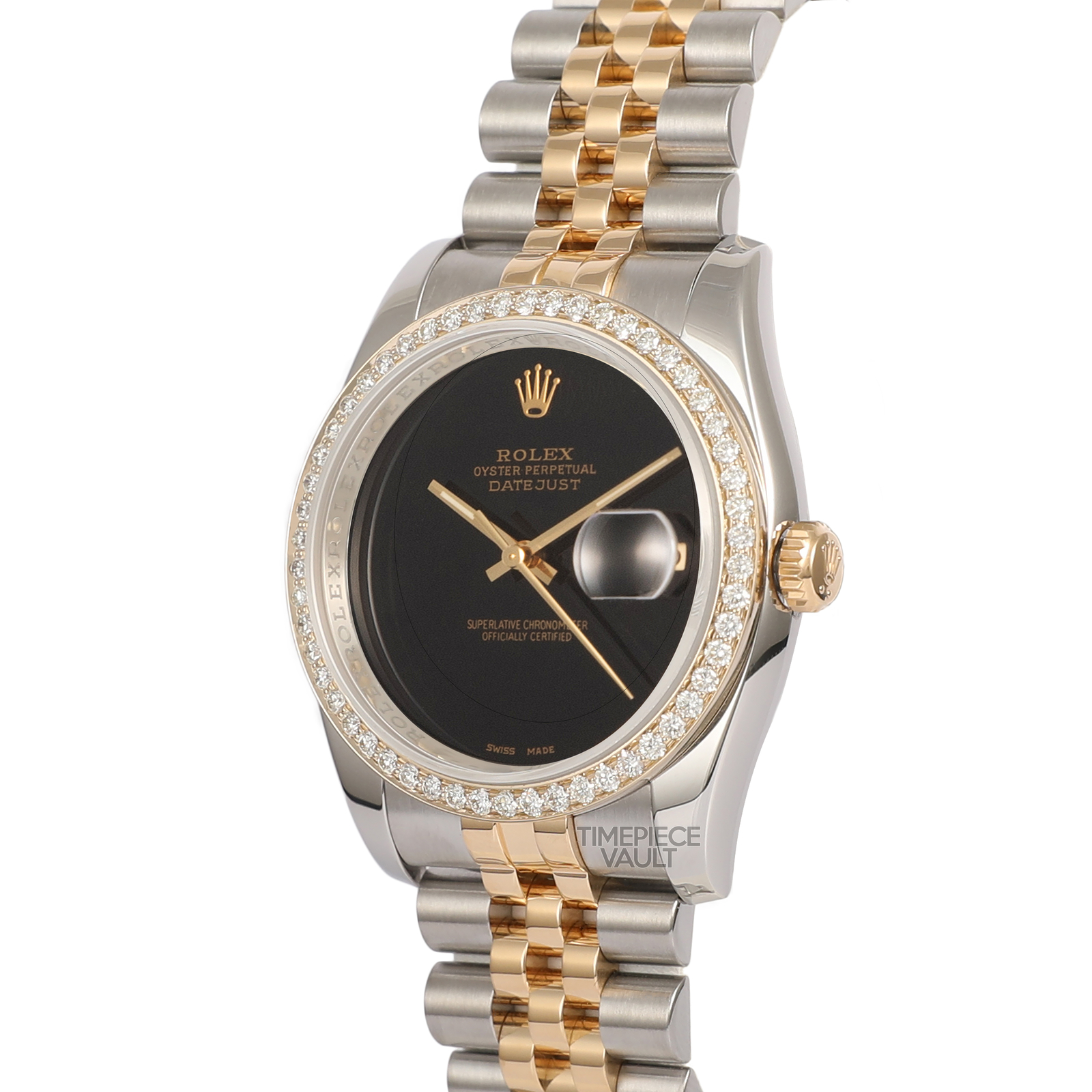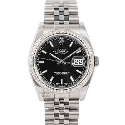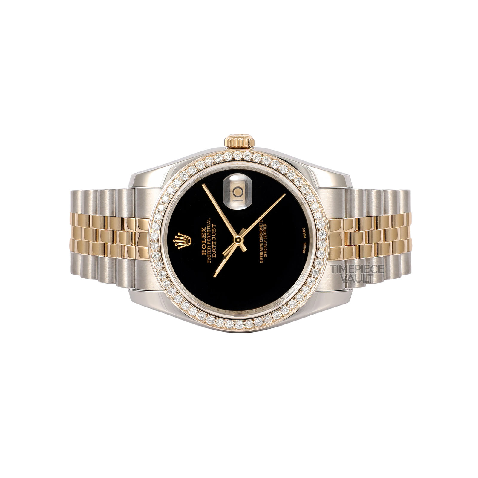 Introducing an authentic Rolex Men's Datejust watch featuring a Rolex 18K yellow gold and stainless steel jubilee bracelet, custom black onyx dial, and custom natural diamond yellow gold bezel. This genuine pre-owned timepiece is impeccably maintained, assuring precise timekeeping, having undergone thorough servicing, polishing, and testing before being offered for sale. With a 36mm case diameter, this Rolex Datejust 116233 is designed for men/unisex and includes a sapphire crystal, Rolex Self-Winding Automatic Quickset 3135 Movement, and a Rolex Two-Tone 18K Yellow Gold and Stainless Steel Jubilee Bracelet with a hidden clasp fitting wrists up to 7.5 inches (additional links available for purchase).