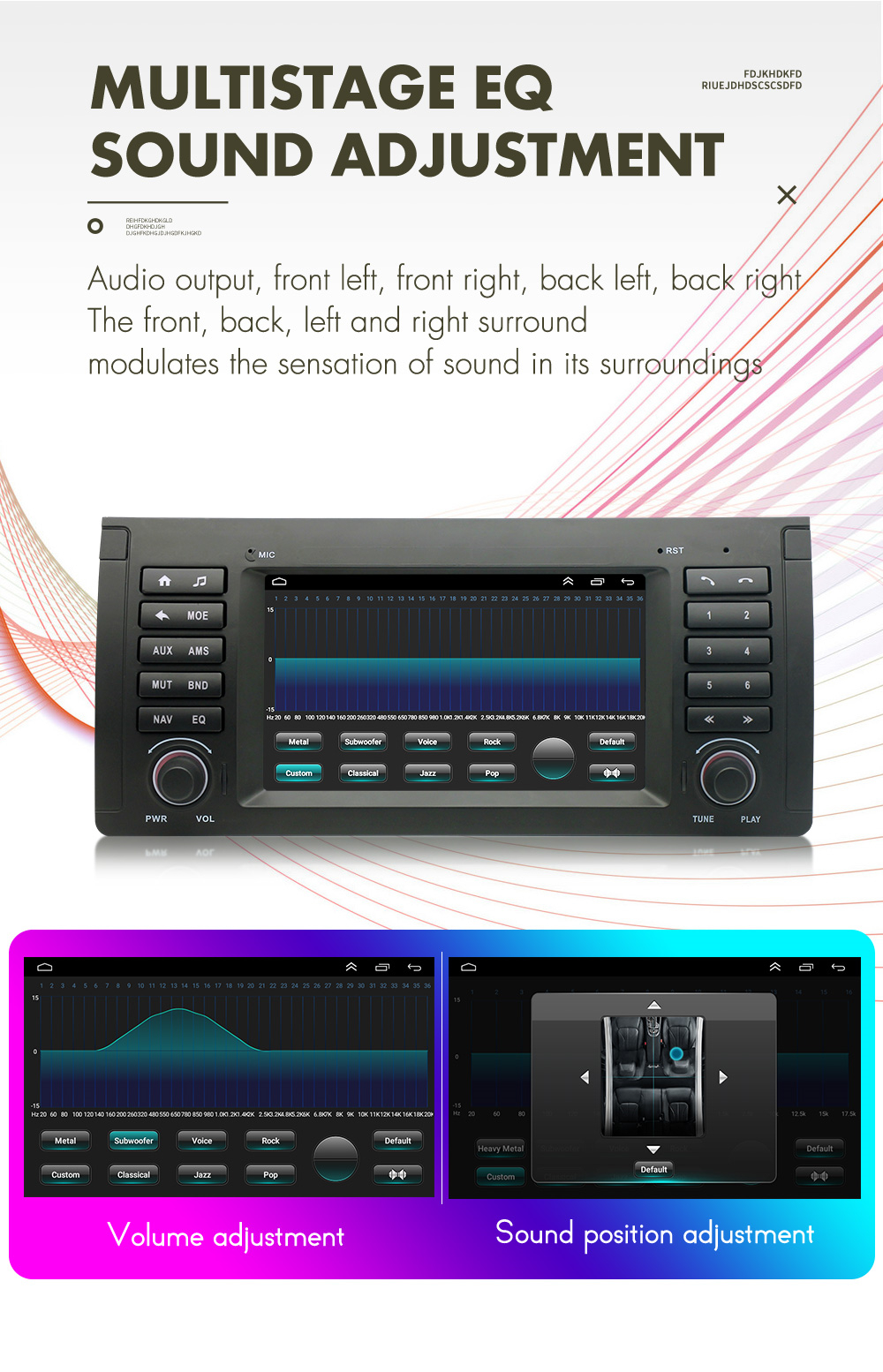- WiFi/Hotspot/Bluetooth: Yes - Brightness level adjustable: Yes - Wallpaper: Wallpapers/Live Wallpapers/Gallery - Sound: Key Tone & Volume - Storage: Display Internal Storage/Nand Flash/Connected Device Storage - Apps: Running Apps display/force stop/uninstall - Security: Yes - Accounts: Yes - Languages and Input: more than 70 Languages and choose input method - Backup and Reset: Yes - Date and Time: Setting Date&Time by yourself or choose GPS/network-provided time - Accessibility: Yes - GPS: Yes, GPS application options/monitoring/sound mode/mixing ratio - Driving safety: Watching Video, Reversing X-mirror/Volume, Reversing Trajectory/radar Display, Rear view ruler - Amplifier: Rock/Pop/Jazz/Classic/Flat/Voice/Custom - Steering Wheel Control: Yes - About Device: Display Parameter Info. |