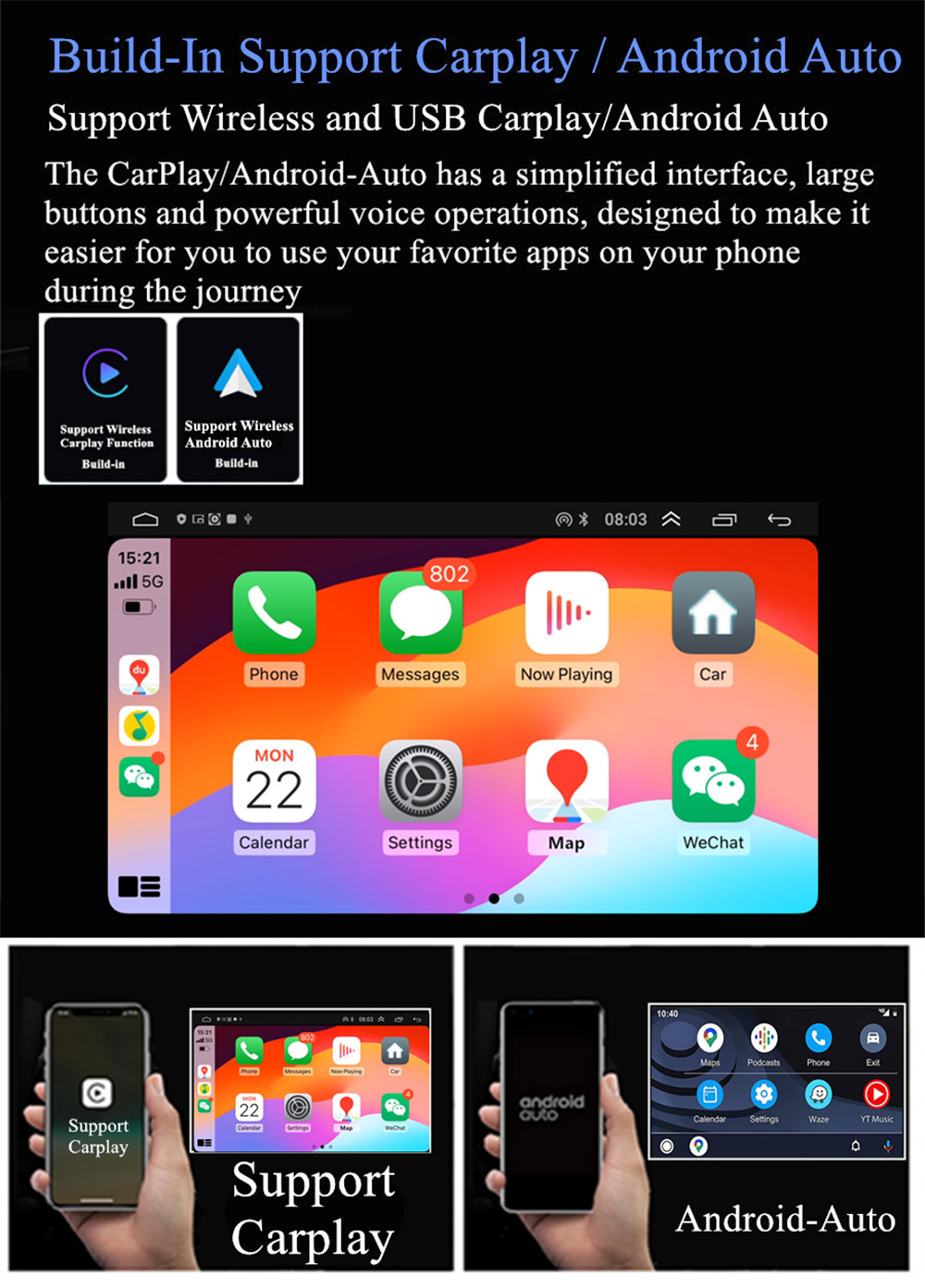 | Support Carplay/Android Auto | -Build-In Support WIFI Wireless & USB Wired Carplay And Android Auto. |