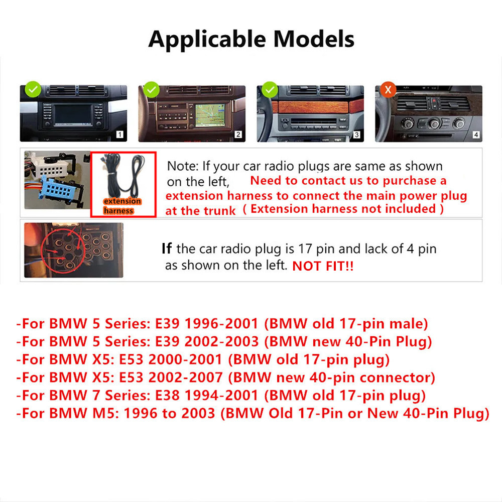 | Fitment | -For BMW 5 Series: E39 1996-2001 (BMW old 17-pin male) -For BMW M5: 1996 to 2003 (BMW Old 17-Pin or New 40-Pin Plug) |