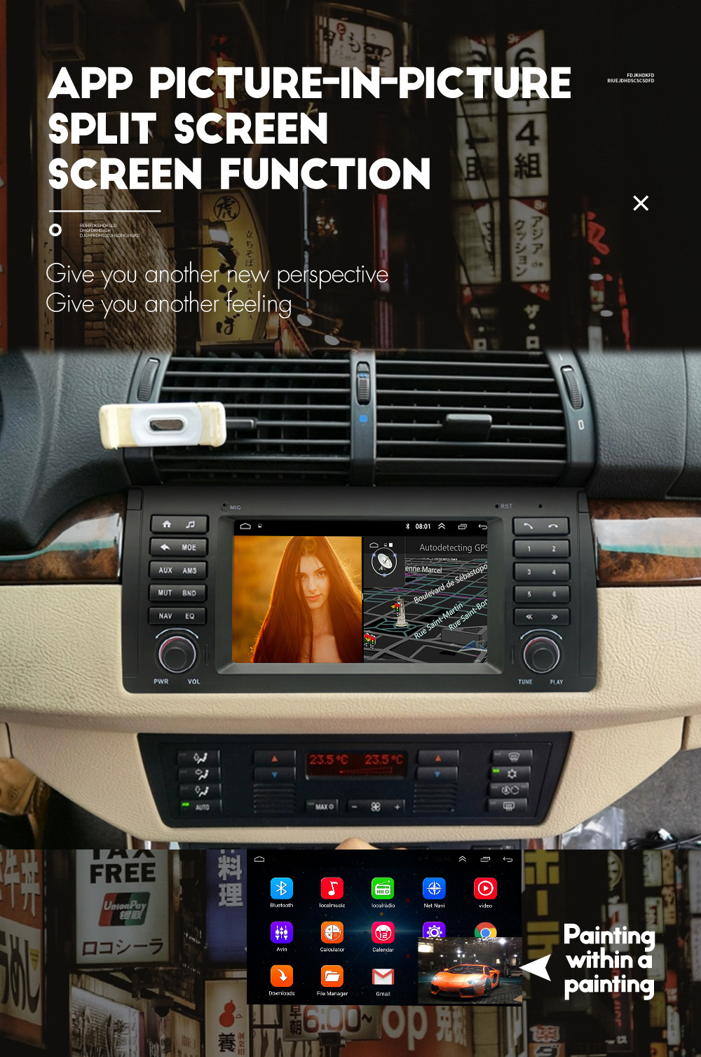 - Touch Screen: Yes - Resolution: 1024*600 - Capacitive or Resistance Screen: Capacitive - Built-in Clock and Calendar: Yes, show real time and can use network-provided time - Main Menu Status Bar display: Can be changed to Music/Radio/BT-Stereo Player and Clock/Date/Week - Change Apps-Icon Position: Yes - Picture in picture split screen:Yes Split screen feature enables you to use two applications at the same time. For example running Navigation with Music Player or Radio with Navigation at the same time. Optimum convenience for both the driver and passengers. |