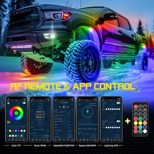 RGB LED Rock Lights, 60 LEDs High Brightness Multifunction Neon underglow Kit Waterproof Light with APP/RF Control Multicolor Lights
