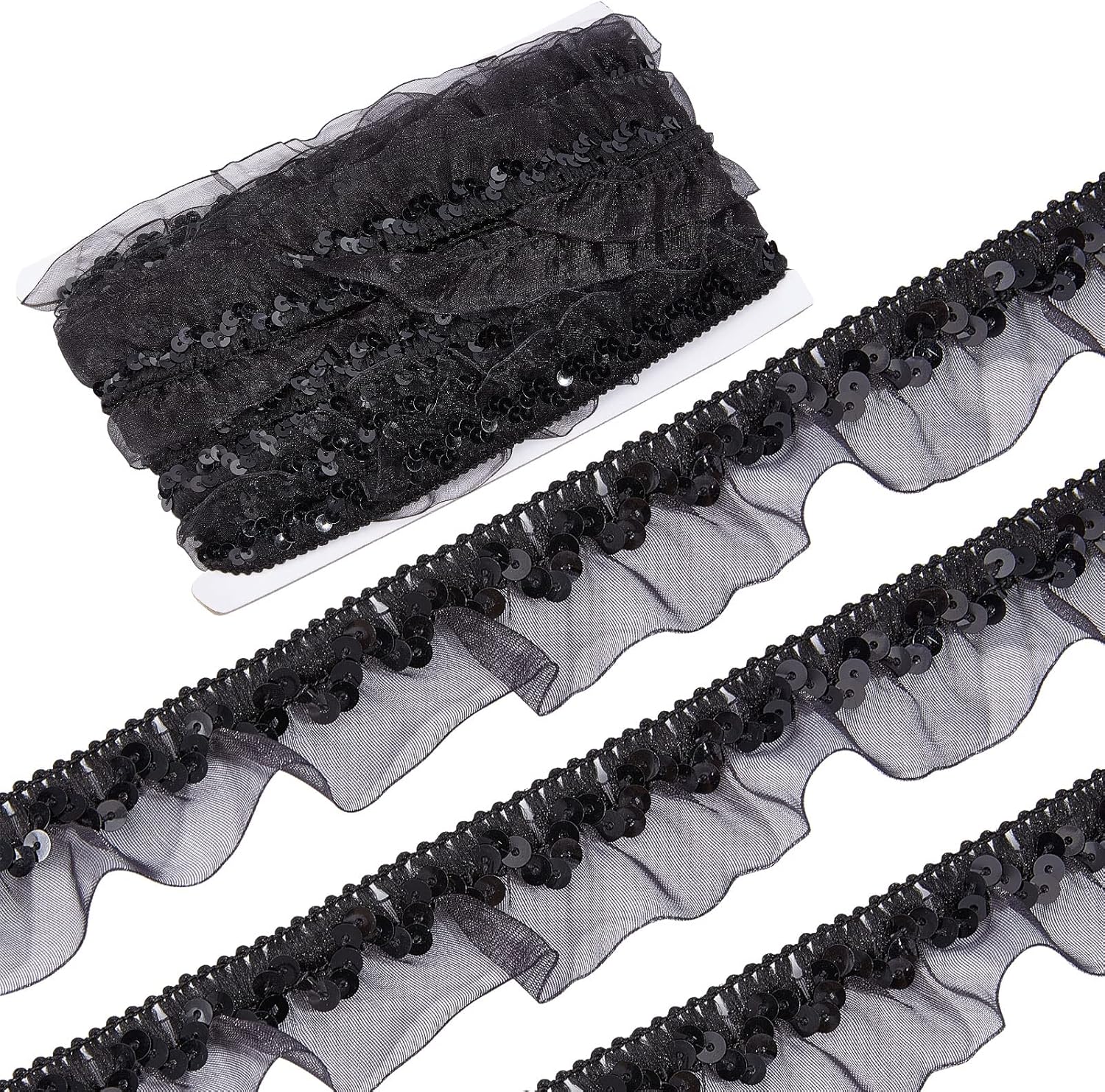 13Yds Black Pleated Ribbon Trim Satin Organza Lace Fabric Sequin Ribbon Elastic
