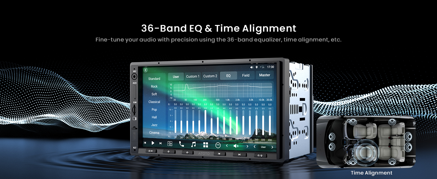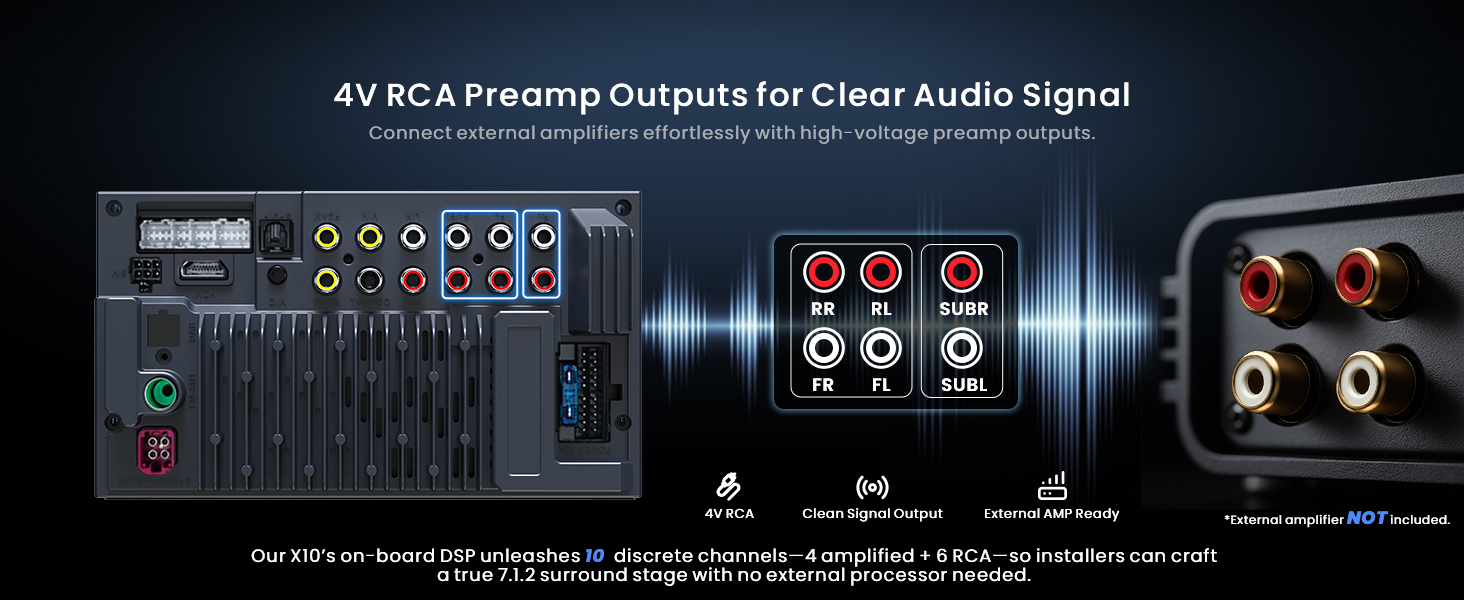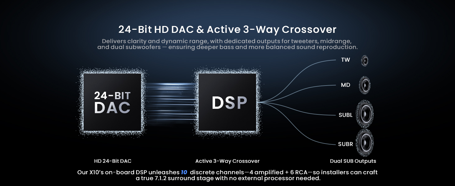 - Evolved Audio Suite: DSP with 36-band EQ, time alignment, 3-way crossover & HD 24-bit DAC. Optical out & 10 assignable channels drive tweeters, subs & more—delivering custom 7.1.2 sound without extra gear. Your car becomes a concert hall