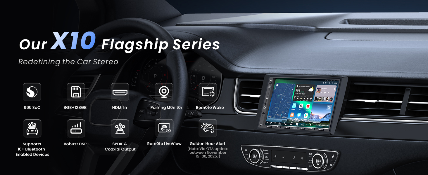 X10 features a QCM SD665 SoC, 8GB RAM, and 128GB storage for fast performance, smooth multitasking, and reliable wireless CarPlay/Android Auto/MirrorLink on a custom AICE 13 UI. The 7" QLED display (1280×720, 550 nits) offers vivid visuals with strong light suppression. Connect two 1080P cameras for simultaneous dual recording, parking monitoring, GPS playback, and enhanced safety. The audio suite includes DSP, 36-band EQ, time alignment, 3-way crossover, HD 24-bit DAC, and 10 assignable channels for immersive 7.1.2 sound. Stay connected with cellular and dual-band Wi-Fi, built-in hotspot, and Google Play/FindApps. DriveChat AI enables advanced voice control and IoT gadget management. Noise-cancelling mic ensures clear calls. OTA updates and 12+6 months support included.