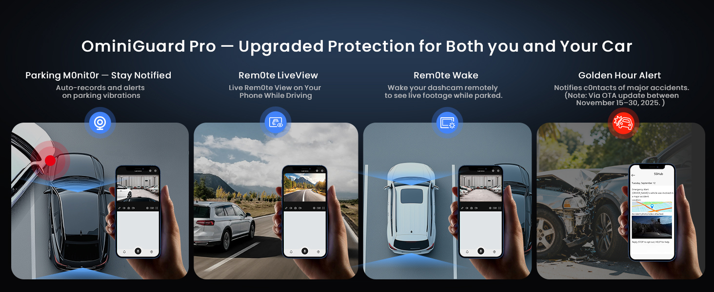 - Dual-Camera Recording: Connect two 1080P cams to record front and rear or interior footage simultaneously. Parking monitoring, emergency video lock, GPS-linked playback, and approaching OmniGuard Pro tech add more confidence to driving
