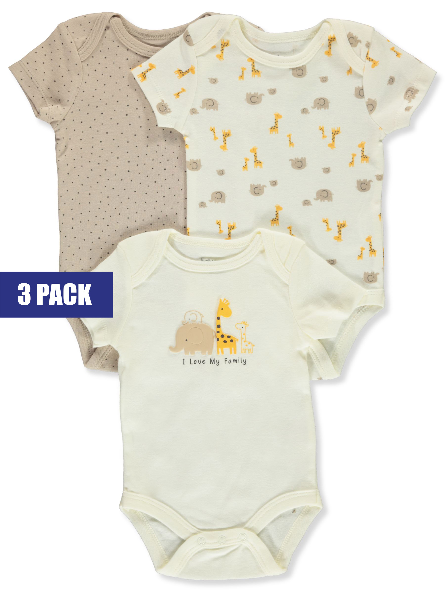 Stock up with this 3-pack from Baby Views! Baby Views 3-pack footed coveralls Cotton construction Ribbed trim Easy-change snaps Lap shoulders 100% cotton Machine wash cold Made in China