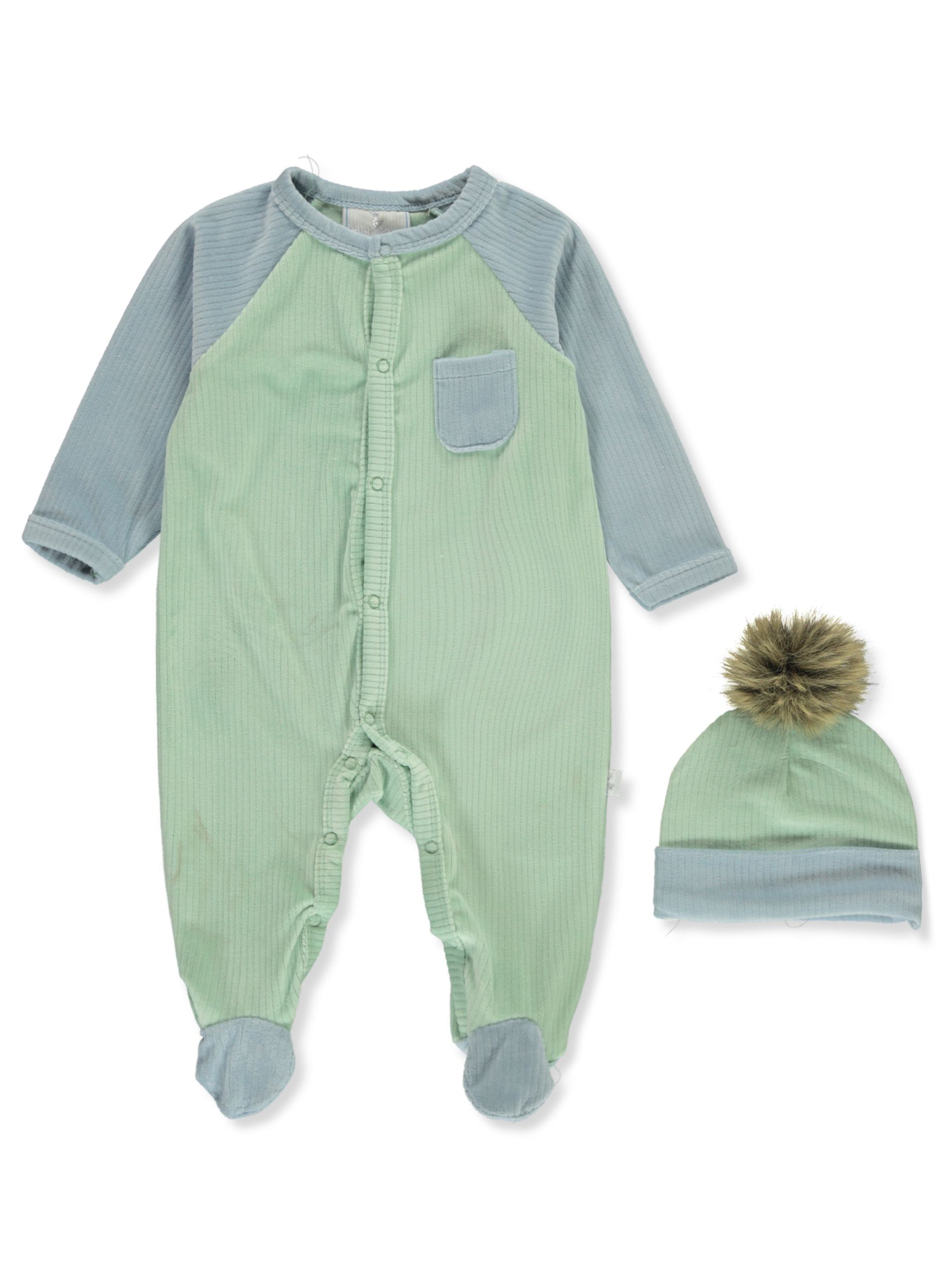 Dress baby from head to toe with this cozy set by Duck Duck Goose! Duck Duck Goose outfit Velour footed coveralls with easy-change snaps (100% polyester) Includes matching cap (100% polyester) Machine wash cold Made in China