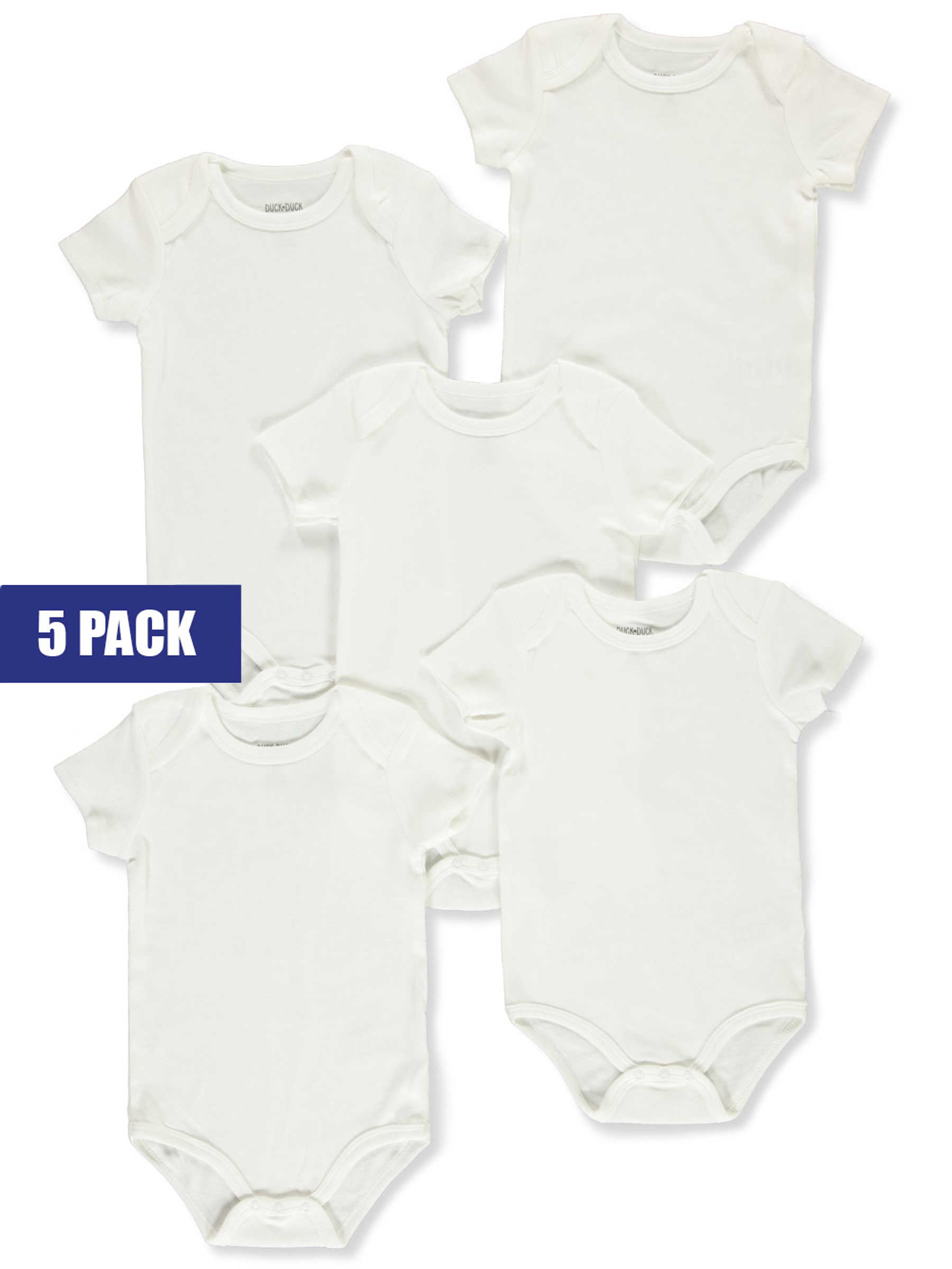 Stock up with this 5-pack from Duck Duck Goose! Duck Duck Goose 5-pack bodysuits Cotton construction Lap shoulders Easy-change snaps 100% cotton Machine wash cold Made in China