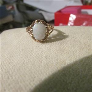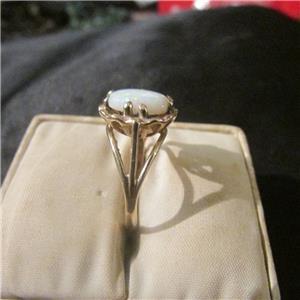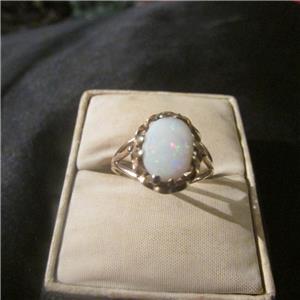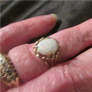 Here is a really lovely vintage 9ct gold & opal ring. The ring has a quality 9ct yellow gold band around to split shoulders & then a a lovely pretty solitaire rusched style setting measuring 10mmx12mm. In the setting is a lovely oval cabouchon opal measuring approx 7mm by 9mm, securely claw set with a good colour play of green yellow, orange pink, purple etc. The ring has a full set of english hallmarks for Birmingham, 9ct gold &1979 & quality makers mark of S&Co & just has wear as you would expect, see pics & small ring size J & a half to K . This really is a very pretty vintage ring in very good origional complete condition that looks so pretty worn & a nice example of these.Please note it was very hard to pick up the colour in the opal in the pics.