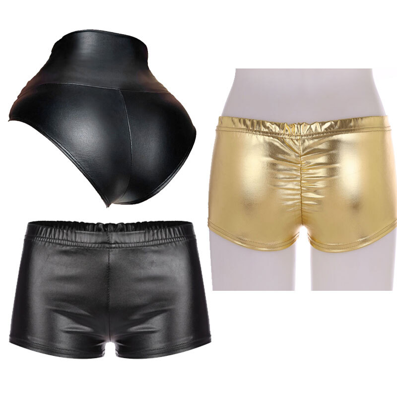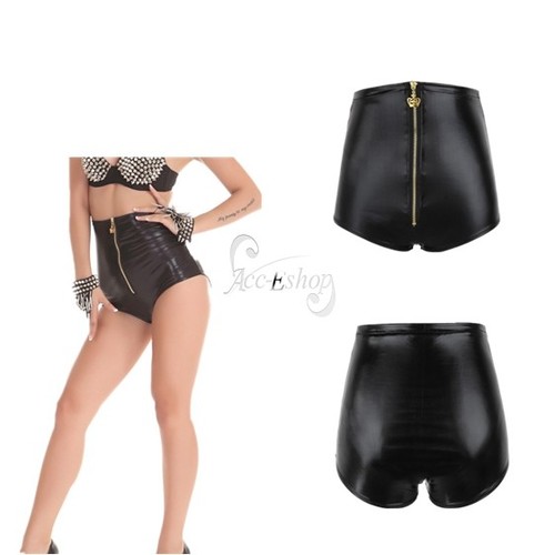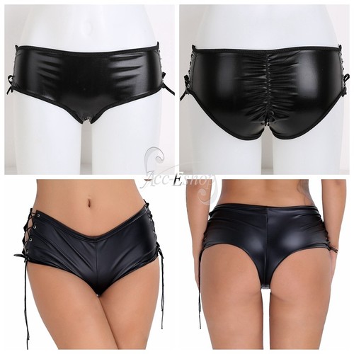 Women’s wet look faux leather mini shorts hot pants, slim cut.