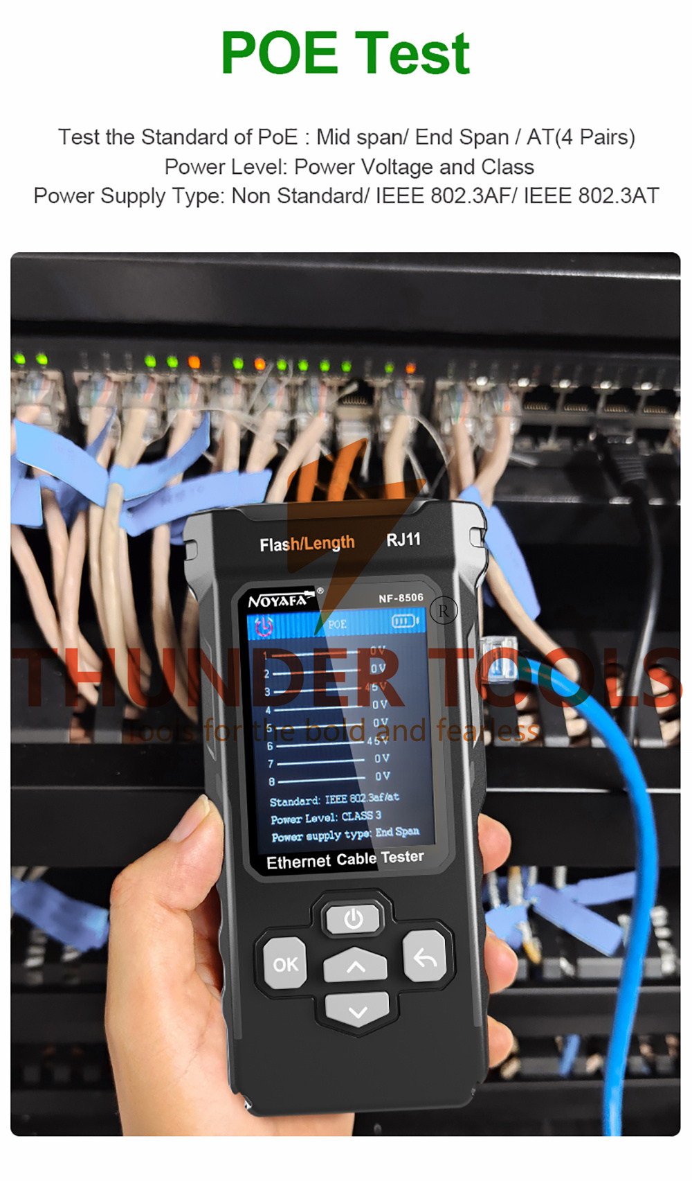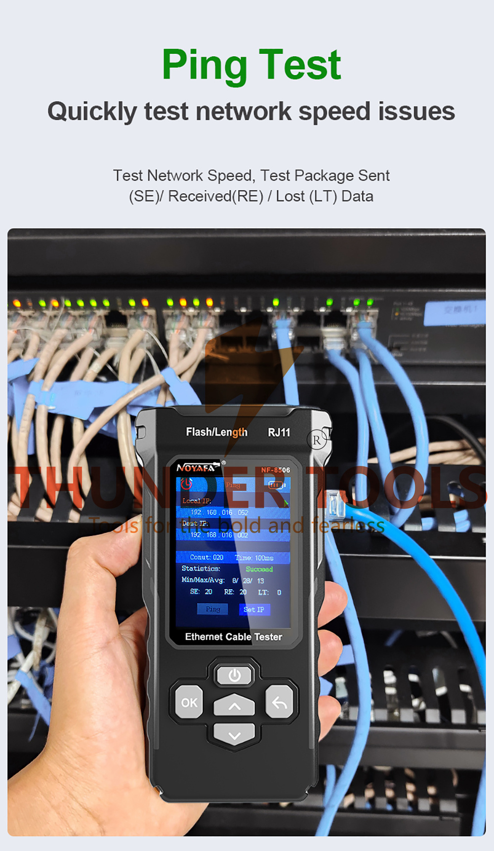 Features: [New Upgraded Multi-function Network Cable Tester]NF-8506 TDR network tester has IP scanning, POE test, cable tracking, continuity test, Ping test, network speed test, port flashing, sensitivity adjustment, cable function of length test and LED flashlight. [Cable Length Measurement]The NF-8506 Network cable tester is a portable cable length tester. The cable tester can accurately measure the cable length in the range of 5-200m, find the cable fault distance and facilitate real-time field measurementt [PING Tester+IP Scanner]This handheld Ping cable tester can be used to diagnose and maintain local area networks (Lans) running TCP/IP protocols. Powerful PING capabilities can verify connections, check the integrity of transmitted and received data, indicate network traffic load by measuring round-trip times and provide IP addresses [Network Speed Test + Cable Continuity Test]Ethernet tester can quickly assess network speed issues. Conducts PING tests from multiple locations to gauge server and website response speeds. Allows users to ensure the integrity and connectivity of network cables by identifying any breaks, openings, or short circuits along the cable length. [POE Tester]Identifies PoE devices efficiently. Detects crossover methods (unknown/end-span/mid-span/8-core power supply) and polarity. Comprehensive PoE detection, including non-standard, IEEE 802.3AF, and IEEE 802.3AT. [Port Flashing and Identification]Facilitates quick identification of network cable ports. Indicator lights on the connected port in the device flash to help locate cables accurately. Displays port information including operating rate, duplex mode, and negotiation settings.
