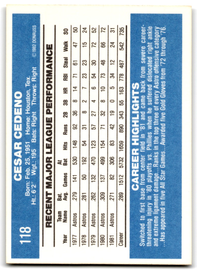 | Description: | Cesar Cedeno | | Category: | Baseball | | Year: | 1982 | | Product: | Donruss | | Team: | Houston Astros | | Card Number: | 118 | | Memorabilia: | N | | Special: | | | Dimensions: | 3½" x 2½" |