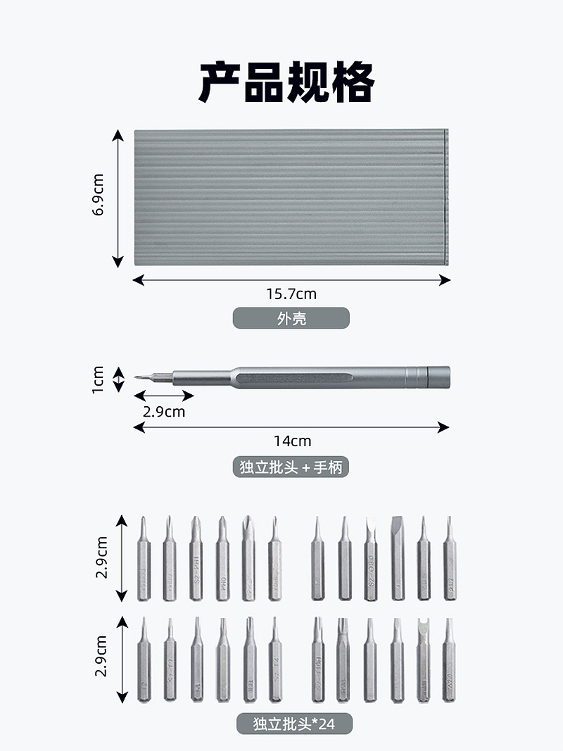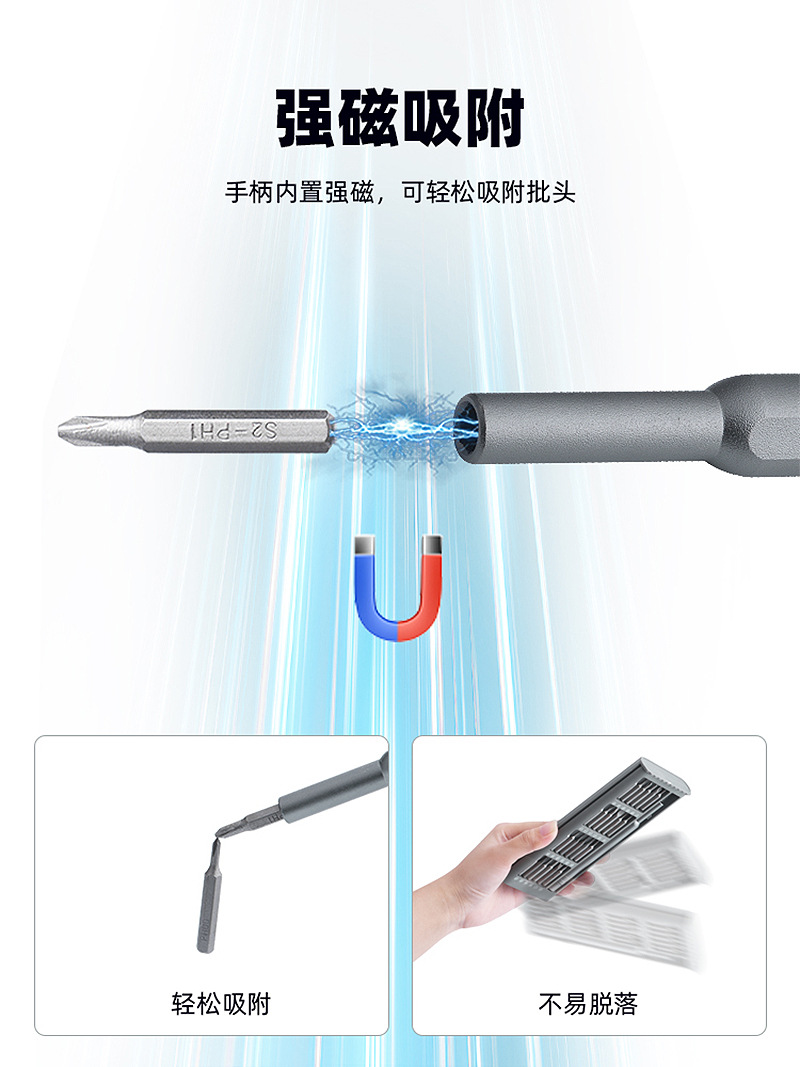 5. Strong magnetic adsorption, the handle is equipped with a strong magnetic field, which can easily adsorb the screwdriver head and screws;